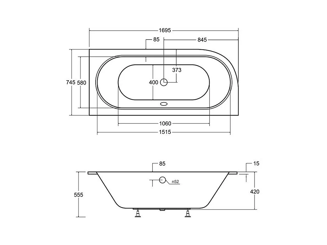 Baignoire asymétrique 170x75 Droite AVITA SLIM acrylique blanc, sans Habillage + Pieds + Vidage à chromé