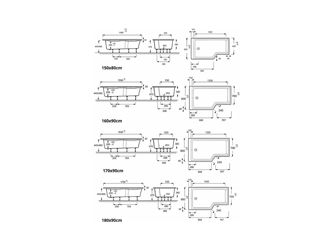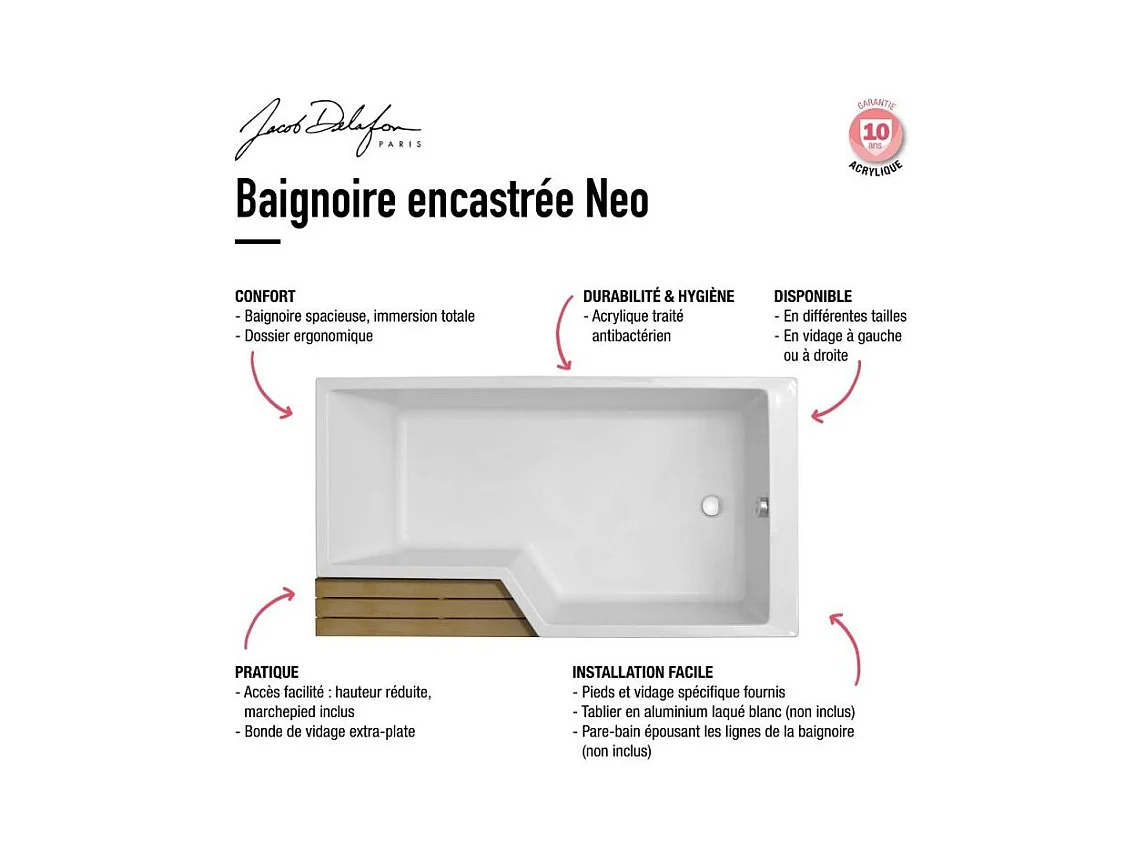 Baignoire bain douche 170 x 90 cm JACOB DELAFON Neo blanc mat droite