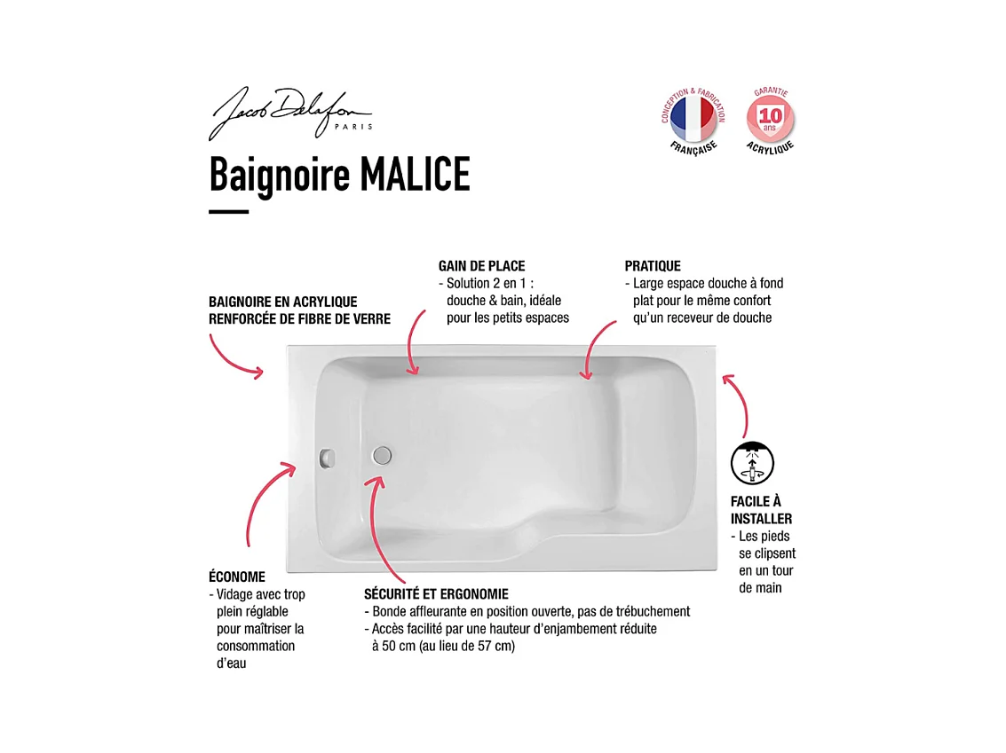 Baignoire bain douche JACOB DELAFON Malice antidérapante + pare bain 160 x 85, version droite