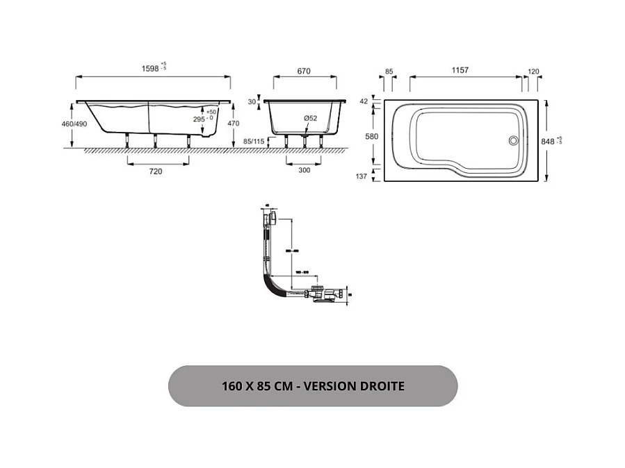 Baignoire bain douche JACOB DELAFON Malice + pare bain + étagère 160 x 85, v. droite