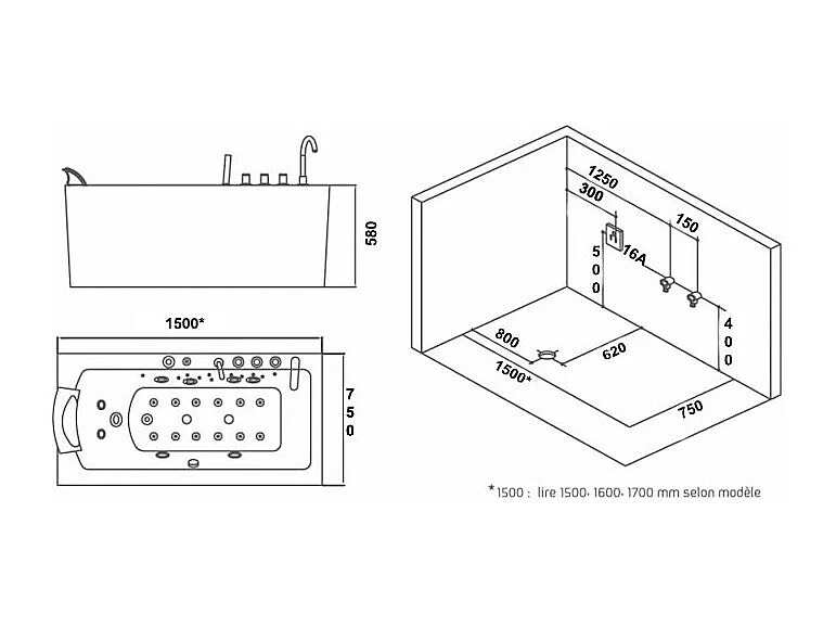 Baignoire balneo HAMILTON 160 droite ARCHIPEL® 160x75