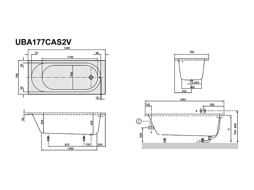 Baignoire droite 170 X 70 VILLEROY ET BOCH O Novo Solo acrylique