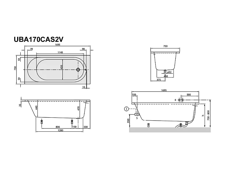 Baignoire droite 170 X 75 VILLEROY ET BOCH O Novo Solo acrylique