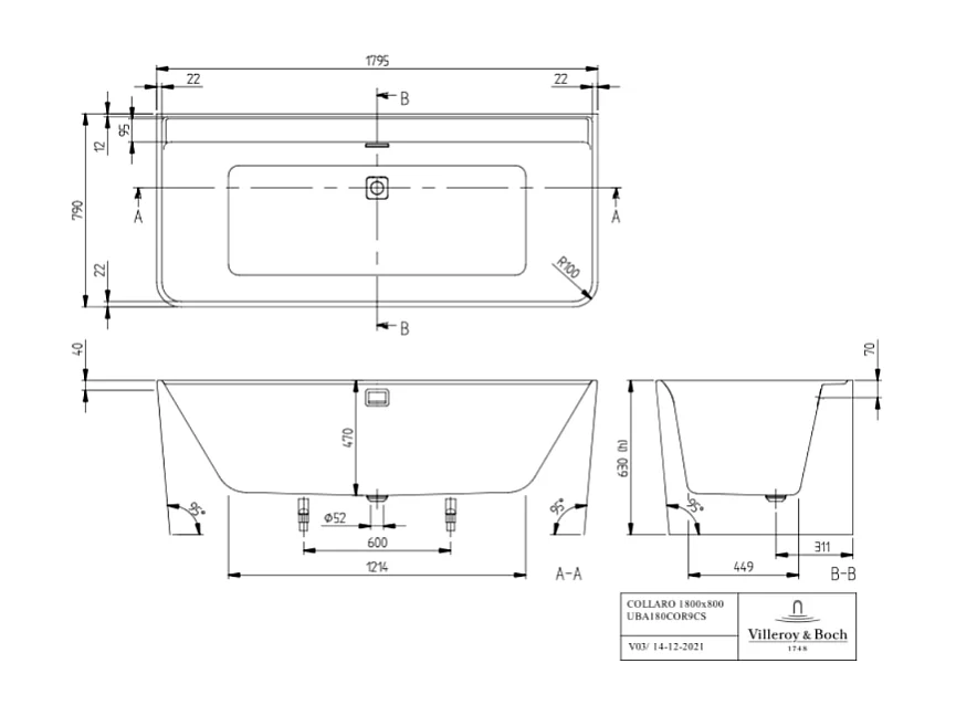 Baignoire droite murale 180 x 80 VILLEROY ET BOCH Collaro vidage blanc