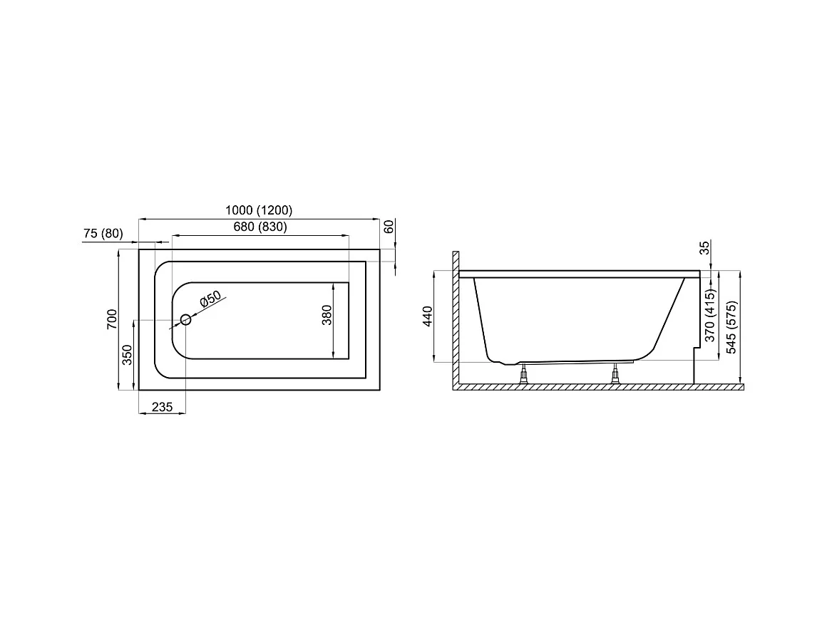 Baignoire rectangulaire 100x70 CAPRI acrylique blanc, sans Habillage + Pieds + Vidage à chromé