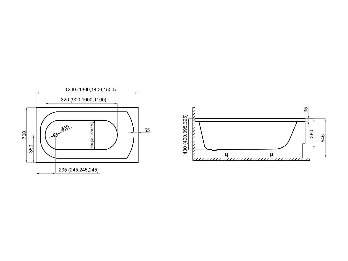 Baignoire rectangulaire 120x70 CLASSIC acrylique blanc, sans Habillage + Pieds + Vidage à chromé