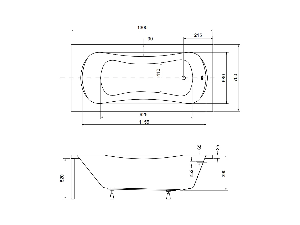 Baignoire rectangulaire 130x70 ARIA PLUS acrylique blanc + Support stabilisateur en polystyrène + Poignées + Pieds + Vidage à chromé