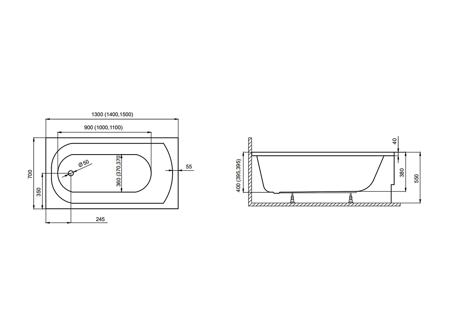 Baignoire rectangulaire 140x70 CLASSIC acrylique blanc, sans Habillage + Pieds + Vidage à chromé