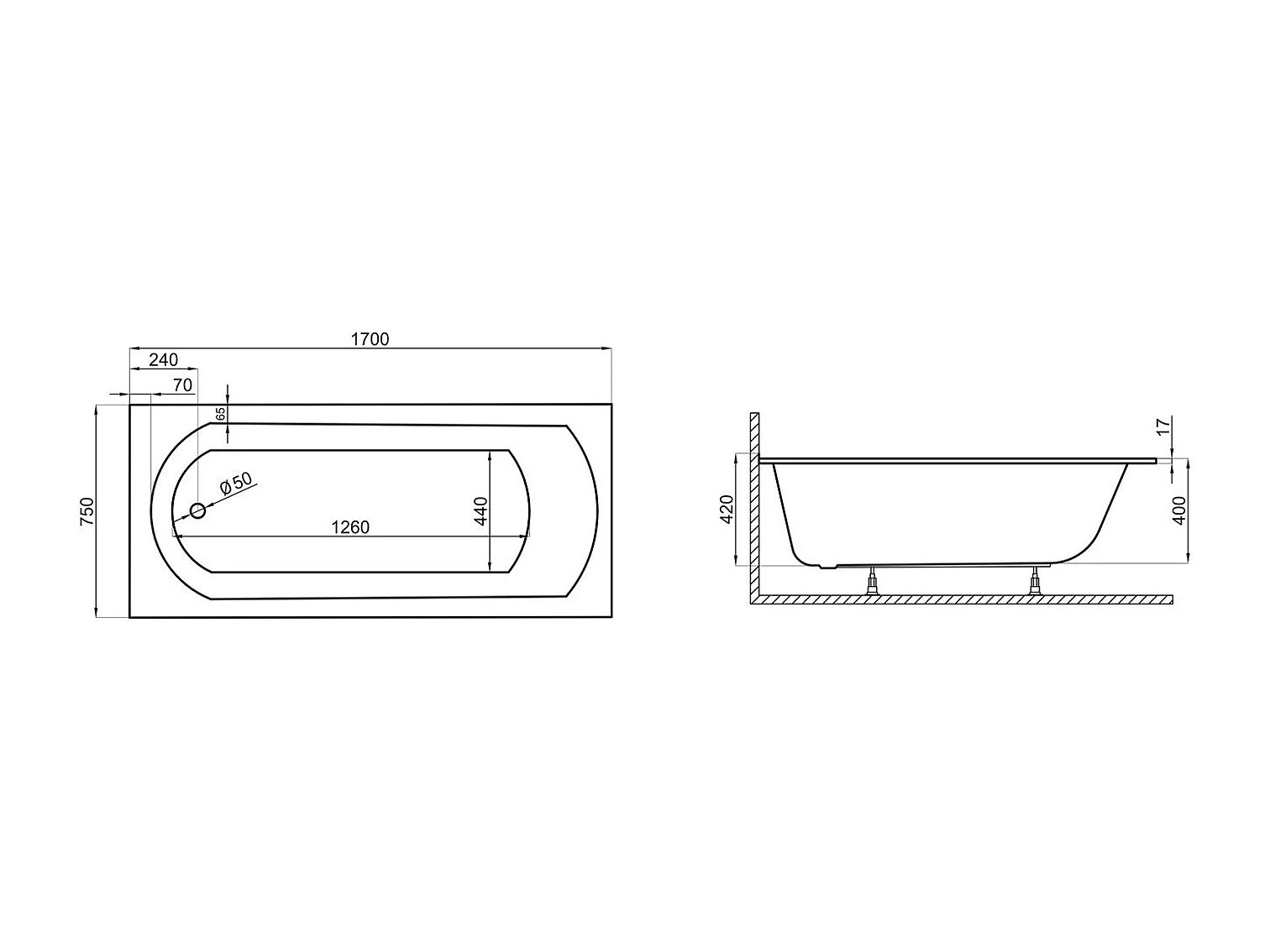 Baignoire rectangulaire 170x75 CLASSIC SLIM acrylique blanc + Habillage en polystyrène (4 cm) + Pieds + Vidage à chromé