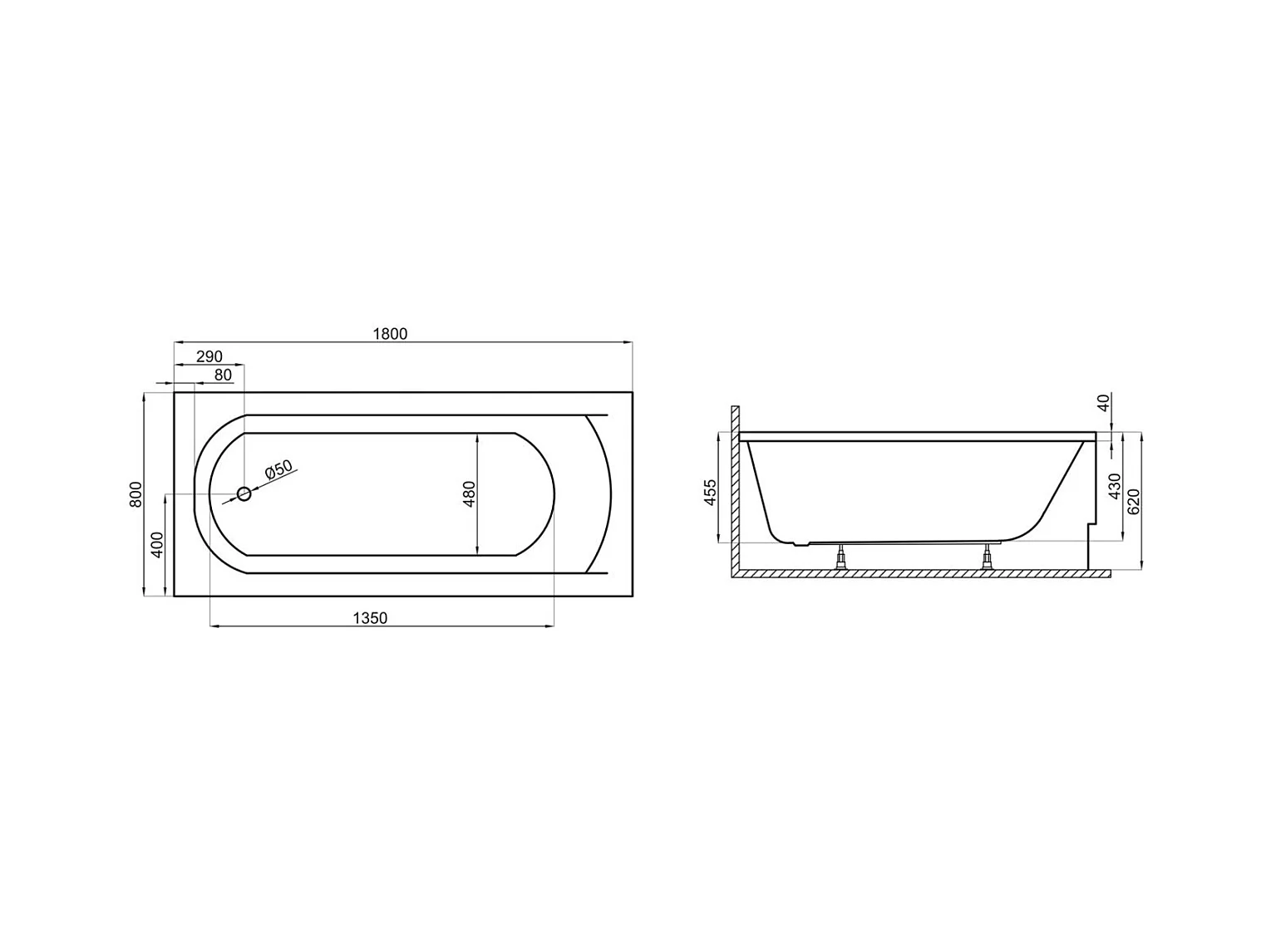 Baignoire rectangulaire 180x80 CLASSIC acrylique blanc, sans Habillage + Pieds + Vidage à chromé