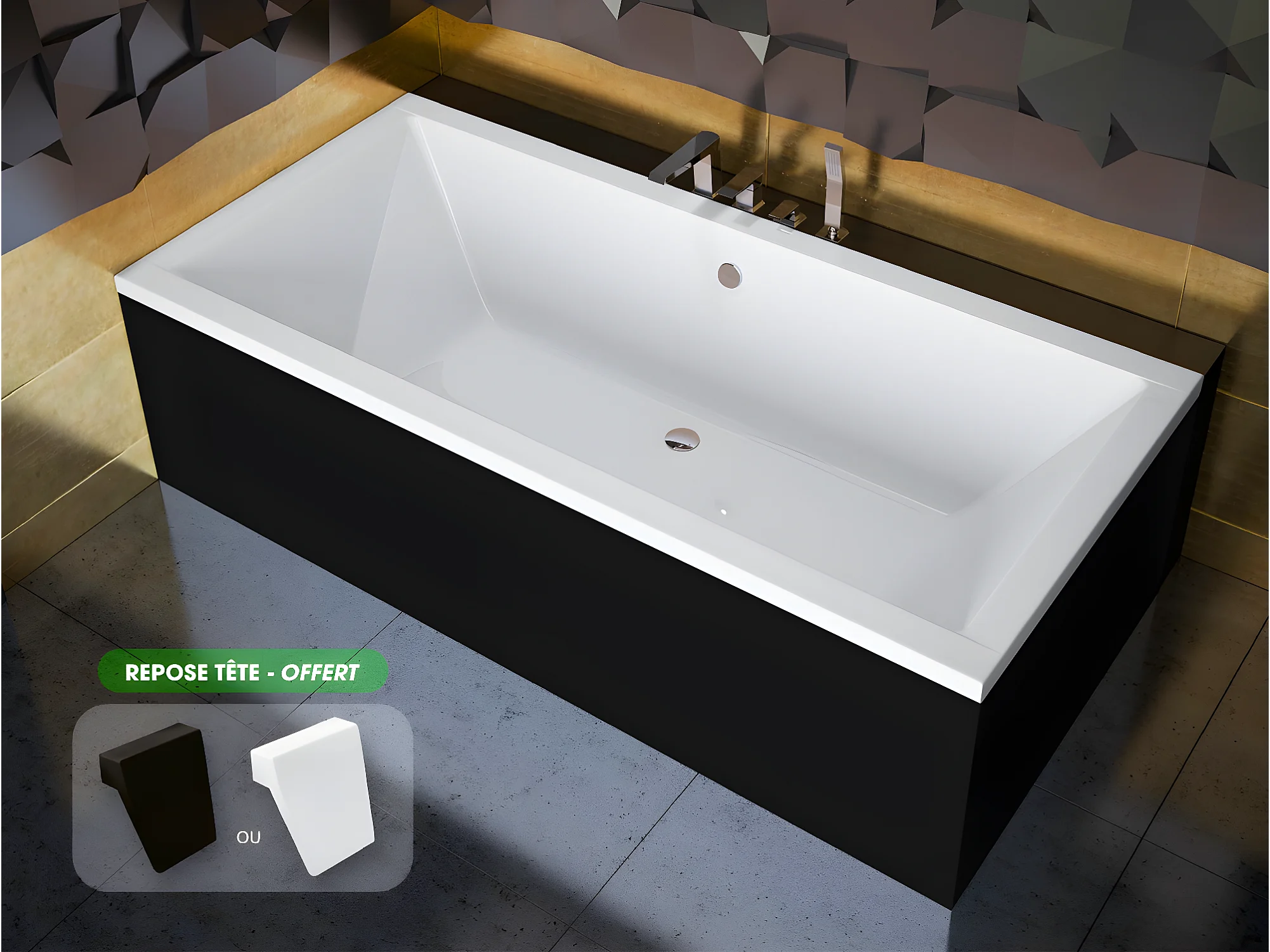 Baignoire rectangulaire - avec Tablier Noir Mat et Repose Tête OFFERT | QUADRO | 170 x75 cm