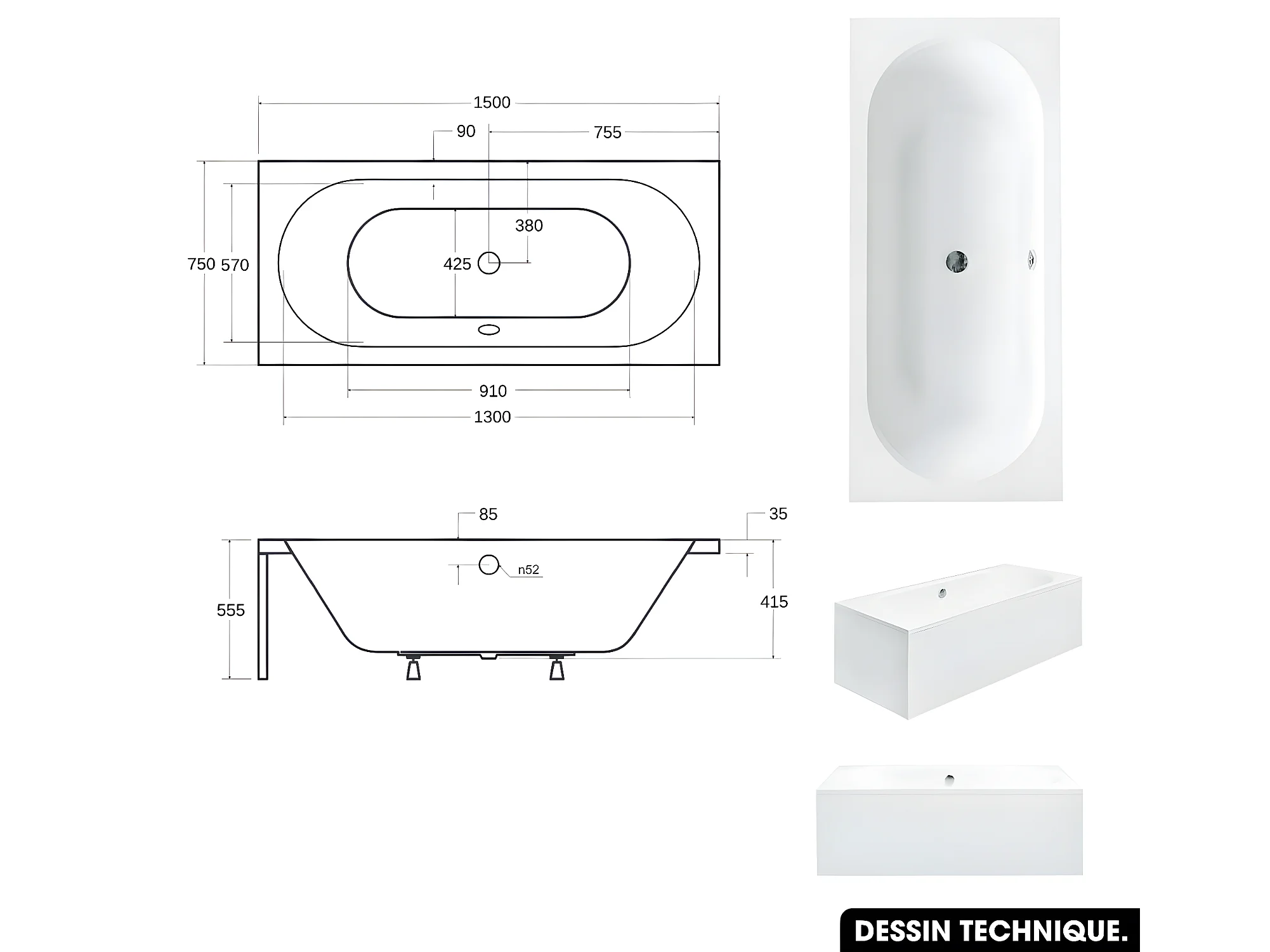 Baignoire rectangulaire - avec Tablier Noir Mat et Repose Tête OFFERT | VITAE | 150 x 75 cm