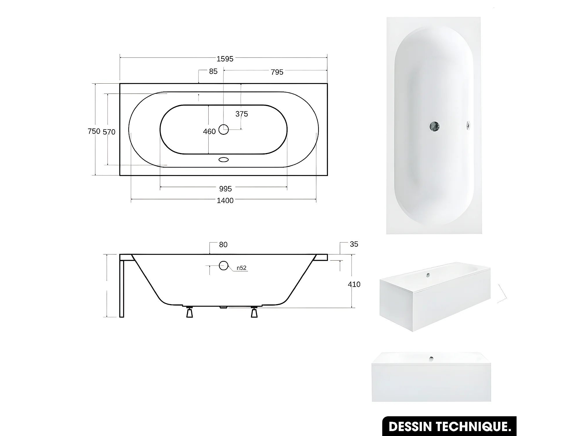 Baignoire rectangulaire - avec Tablier Noir Mat et Repose Tête OFFERT | VITAE | 160 x 75 cm