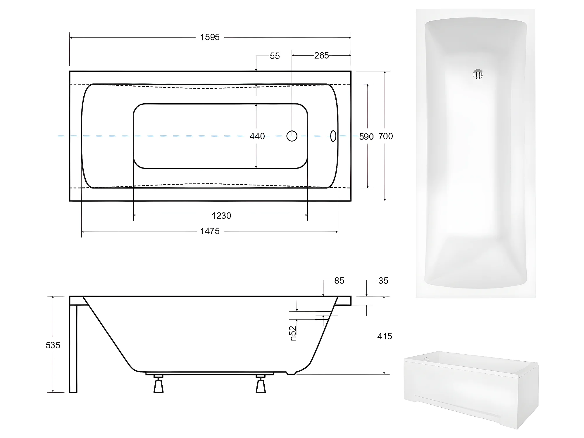 Baignoire rectangulaire + tablier noir mat + repose tête - OPTIMA - 160 x 70 cm