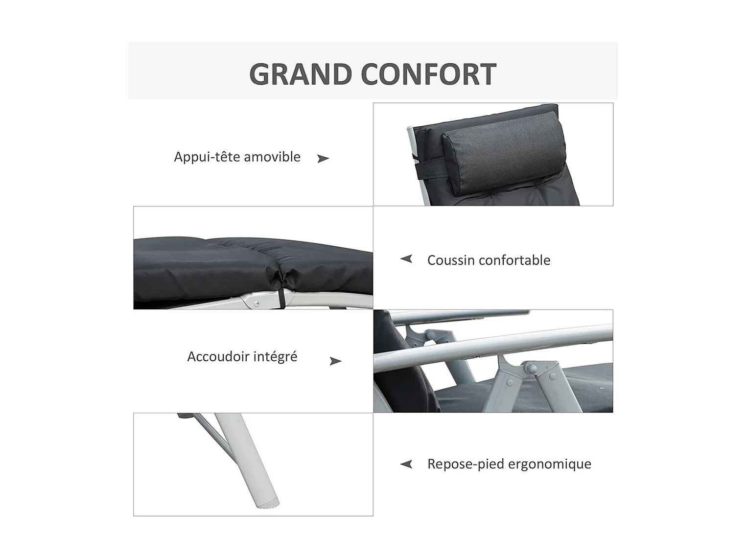 Bain de Soleil pliable transat inclinable 7 Positions Chaise Longue Grand Confort avec Matelas + accoudoirs métal époxy textilène Polyester noir