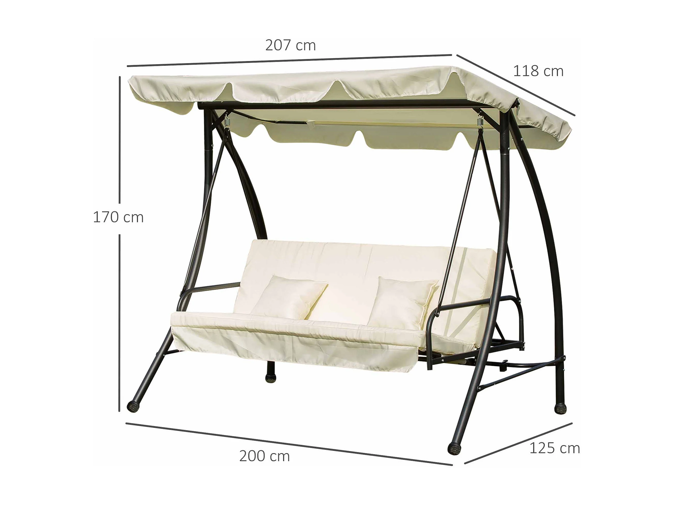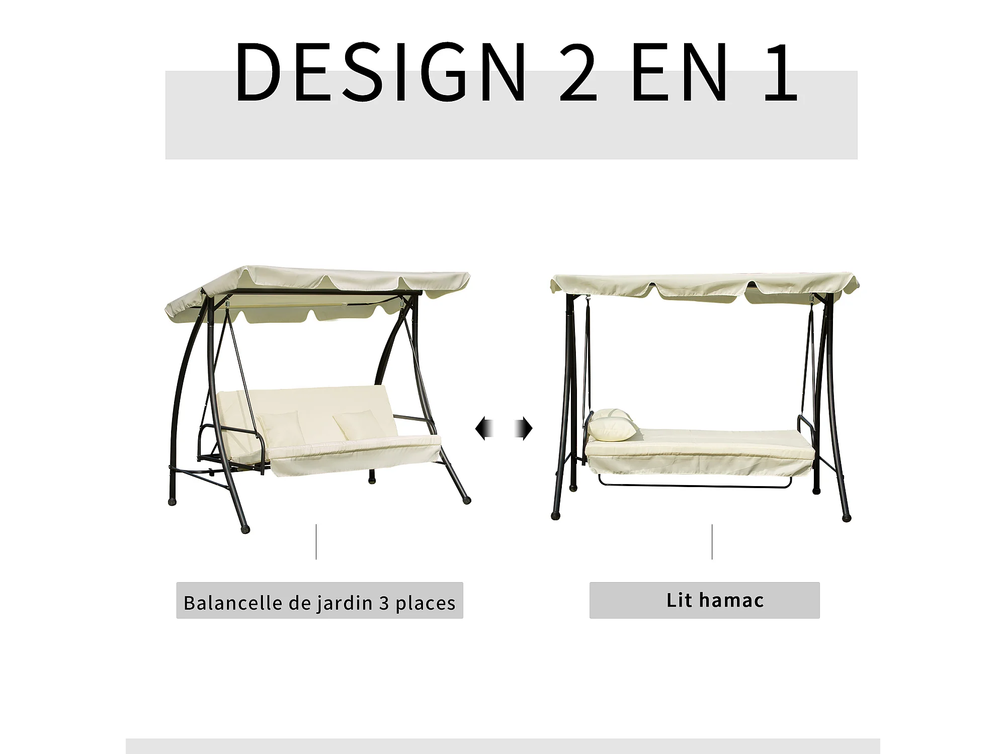 Balancelle de jardin convertible 3 places grand confort inclinaison toit réglable matelas et coussins fournis 2L x 1,25l x 1,7H m métal polyester noir et crème