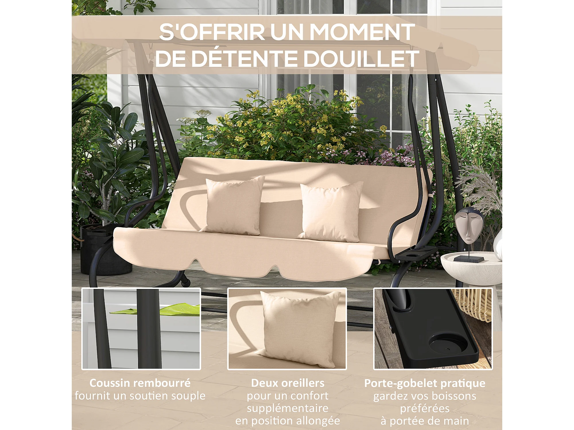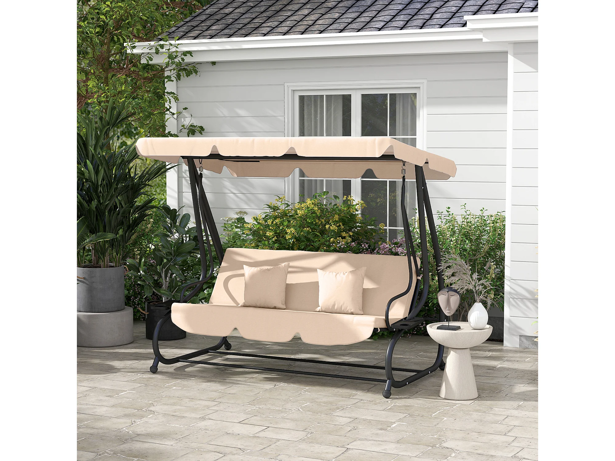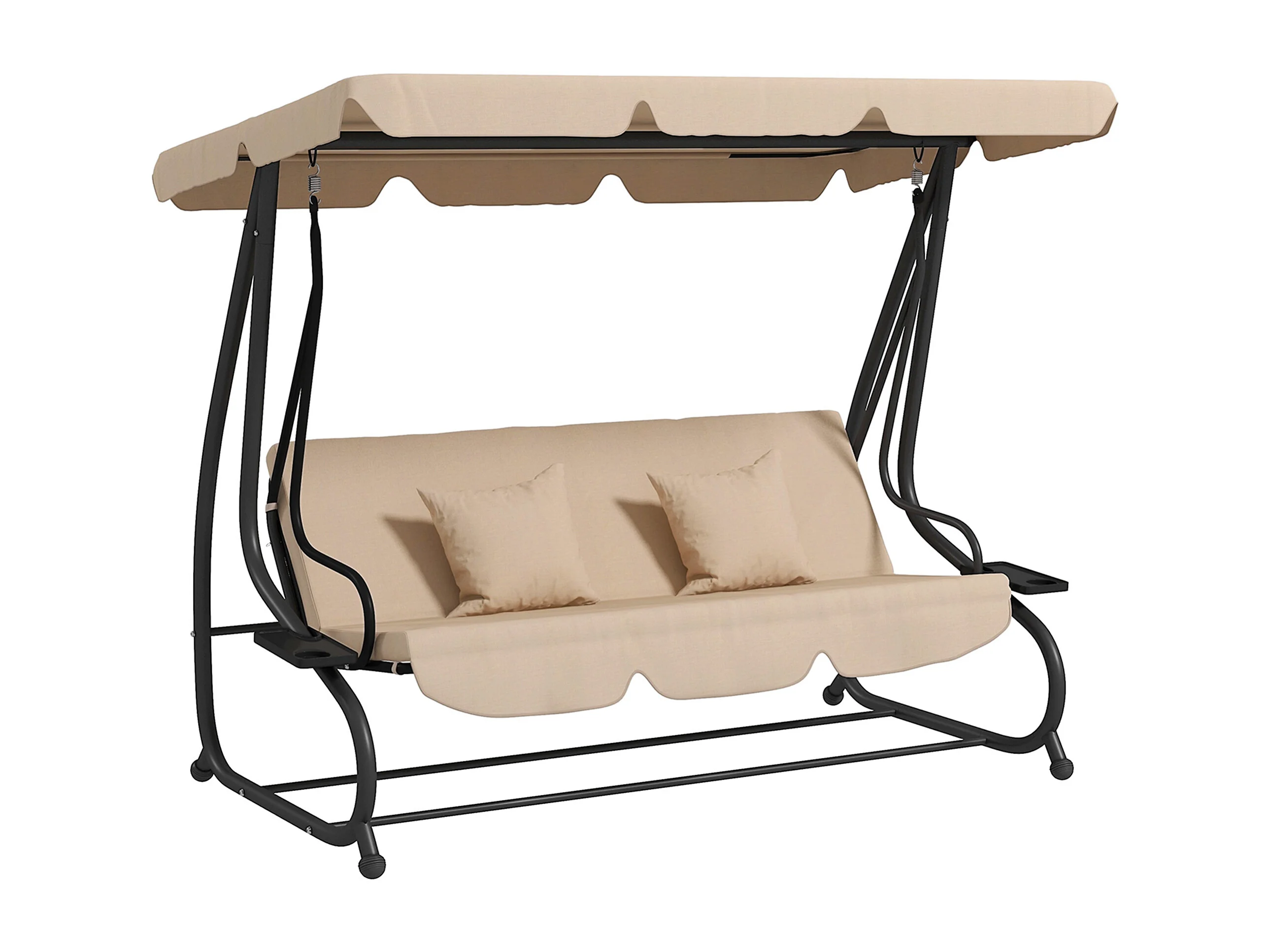 Balancelle de jardin convertible 3 places inclinaison toit réglable 2 tablettes + matelas 2L x 1,2l x 1,64H m métal époxy noir polyester sable