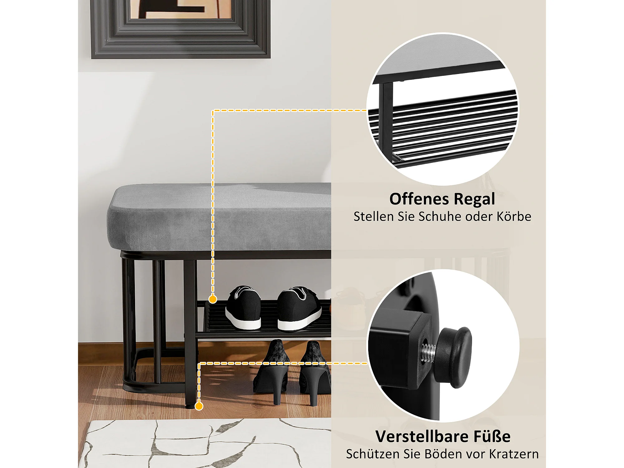 Banc à chaussures moderne avec assise en velours et structure métallique stable, pieds réglables, gain de place, gris et noir (80x35x39.5 cm)