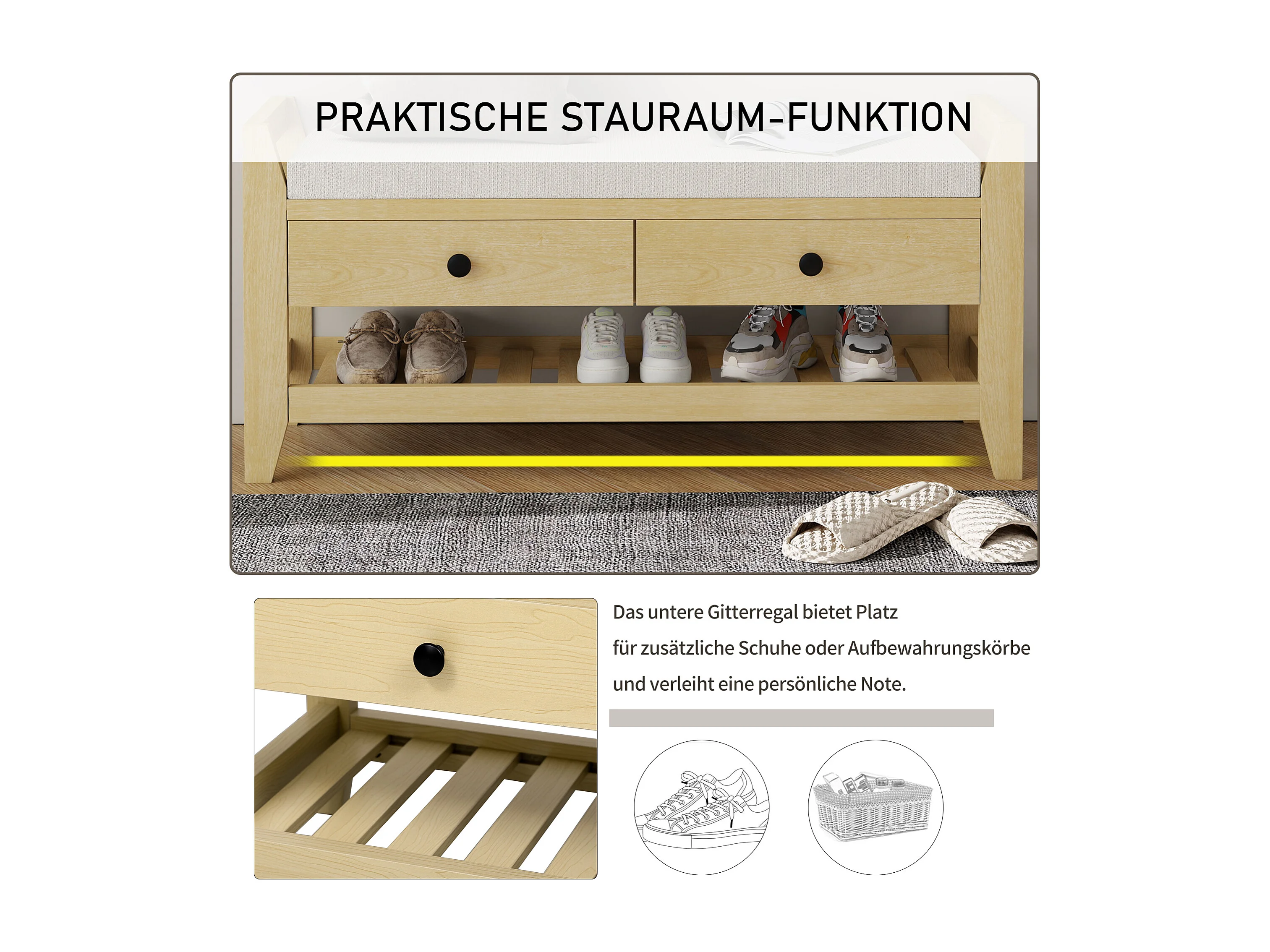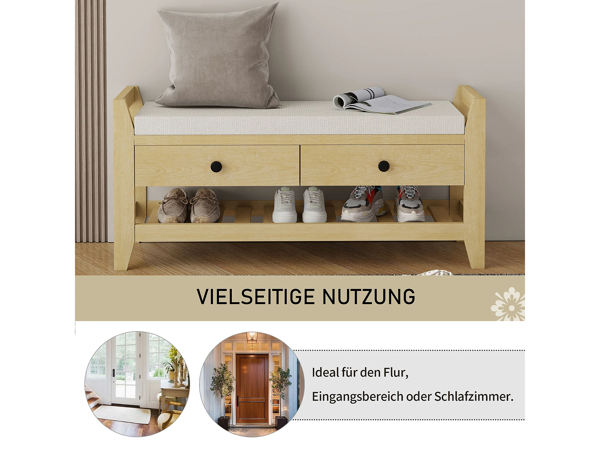 Banc à chaussures moderne avec assise et rangement, surface en coussin doux, étagère à chaussures pour entrée, MDF, naturel (101x35x50 cm)