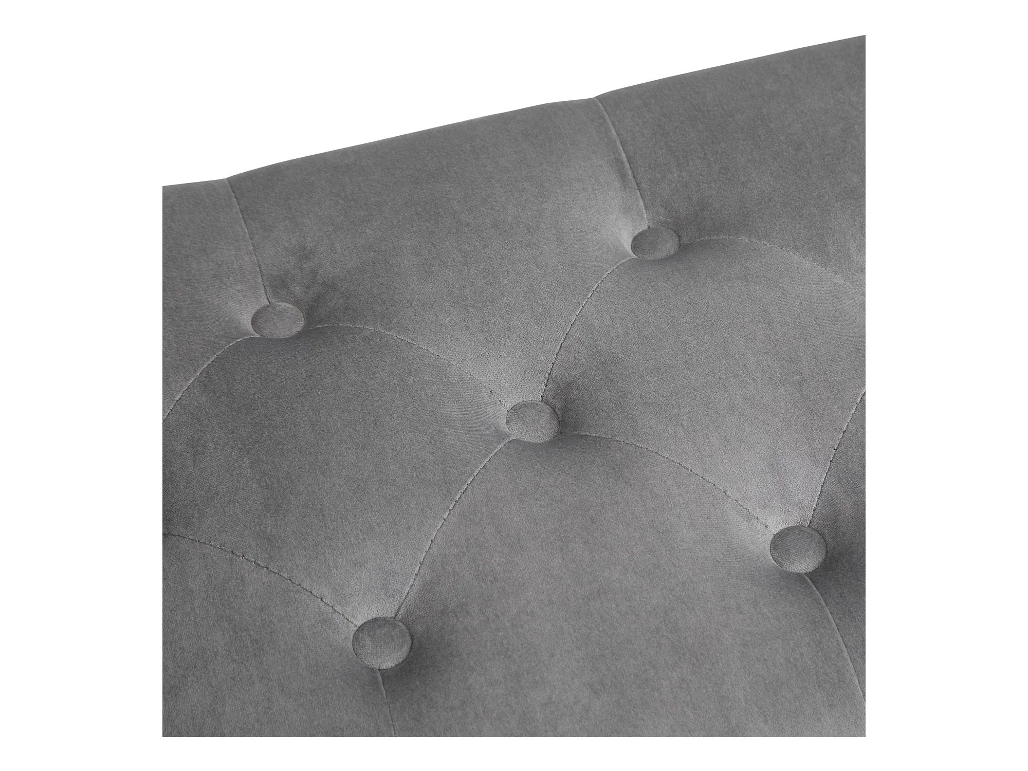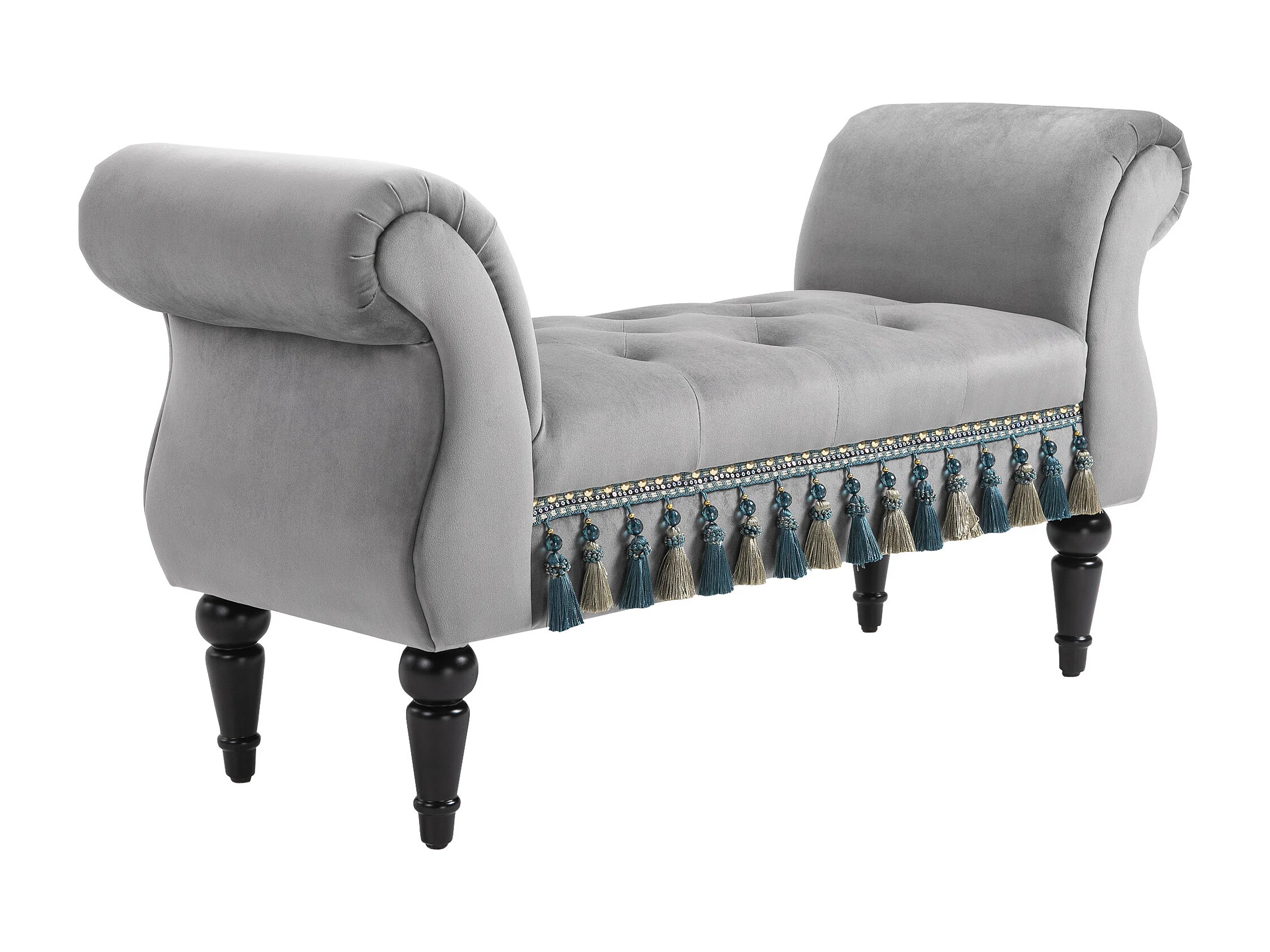 Banc banquette capitonnée design accoudoirs courbés pompons pieds bois hévéa revêtement velours gris