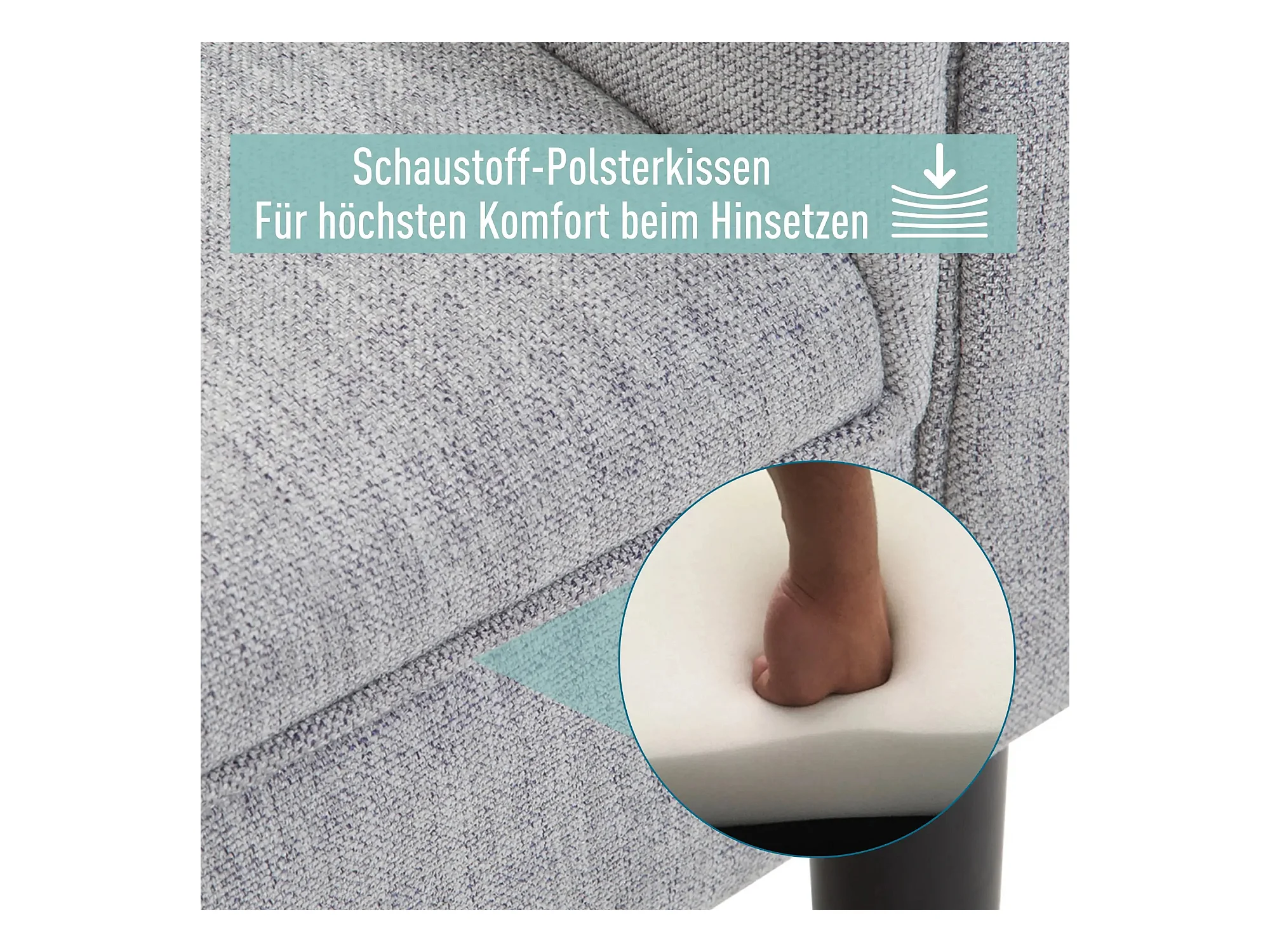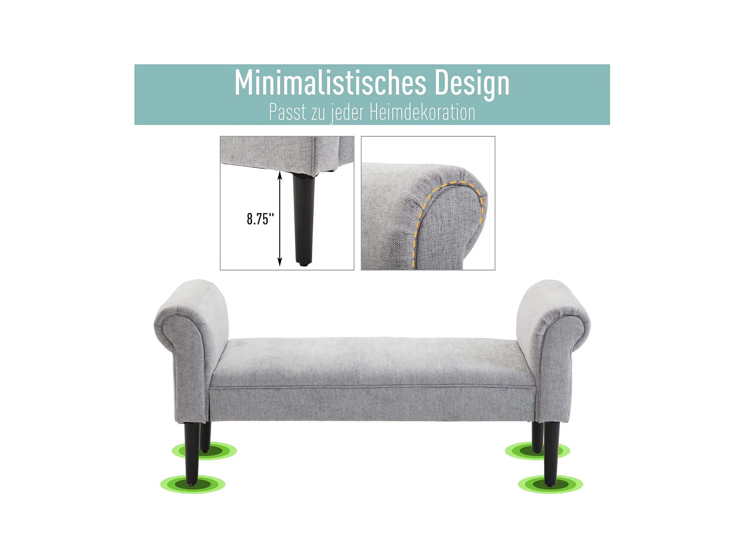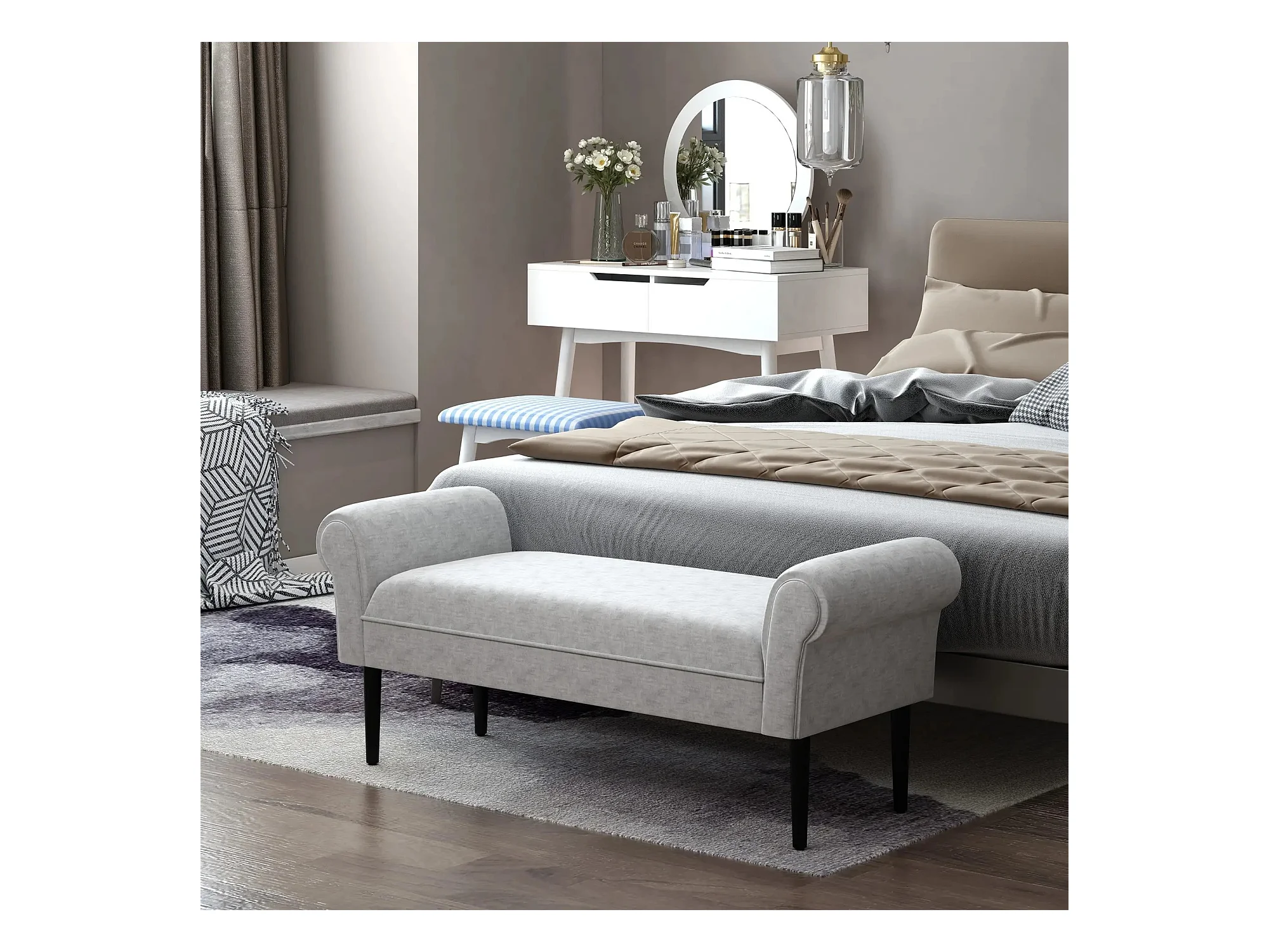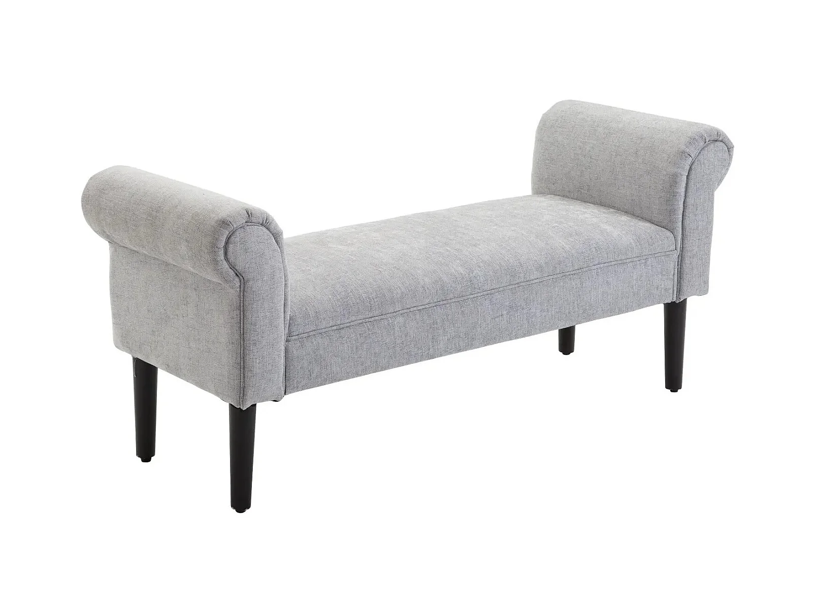 Banc rembourré élégant avec accoudoirs roulés, polyester, gris clair (132x45.5x58cm)