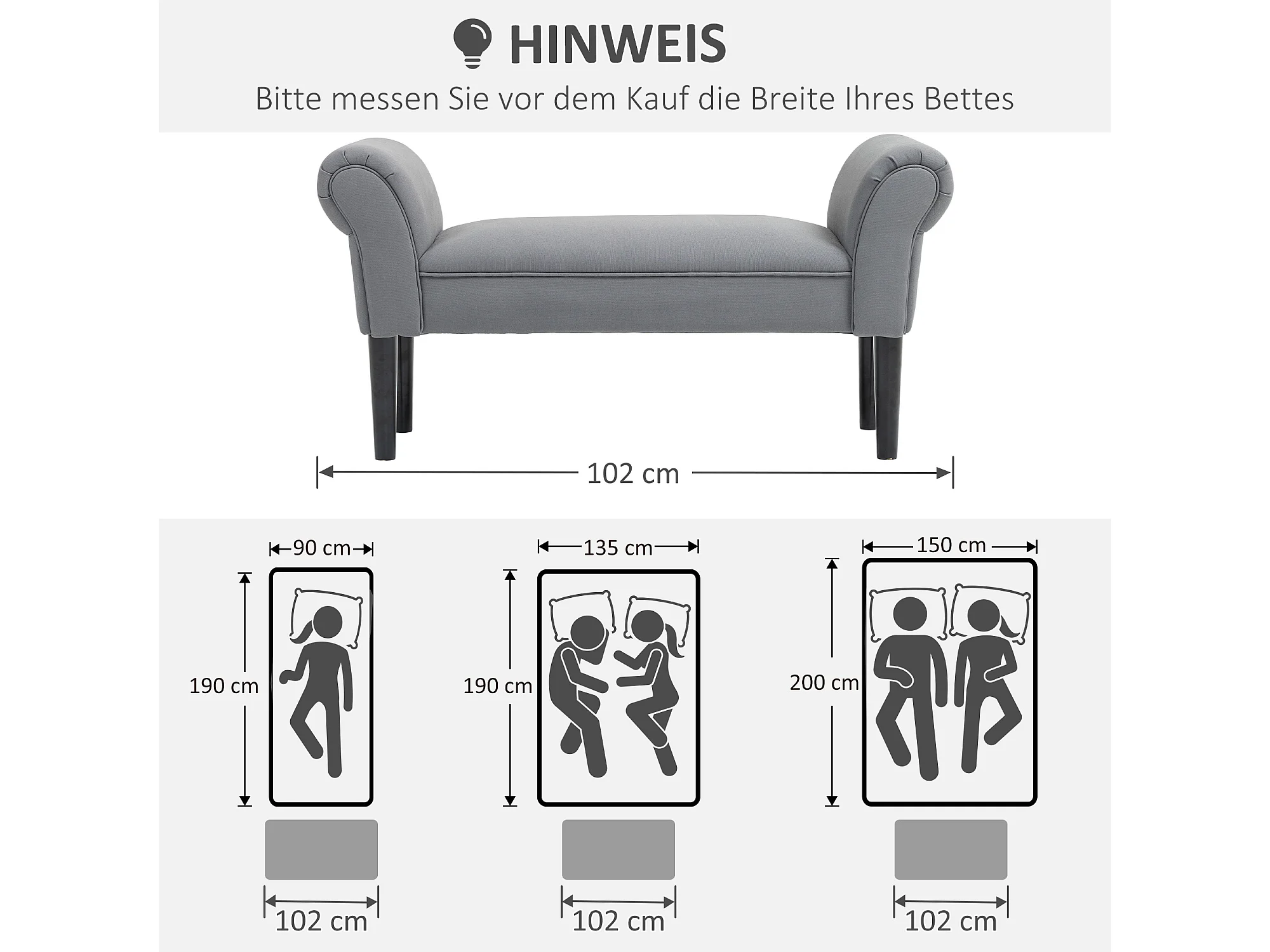 Banc rembourré polyvalent, structure MDF, tissu voile, gris foncé (102x36x51cm)