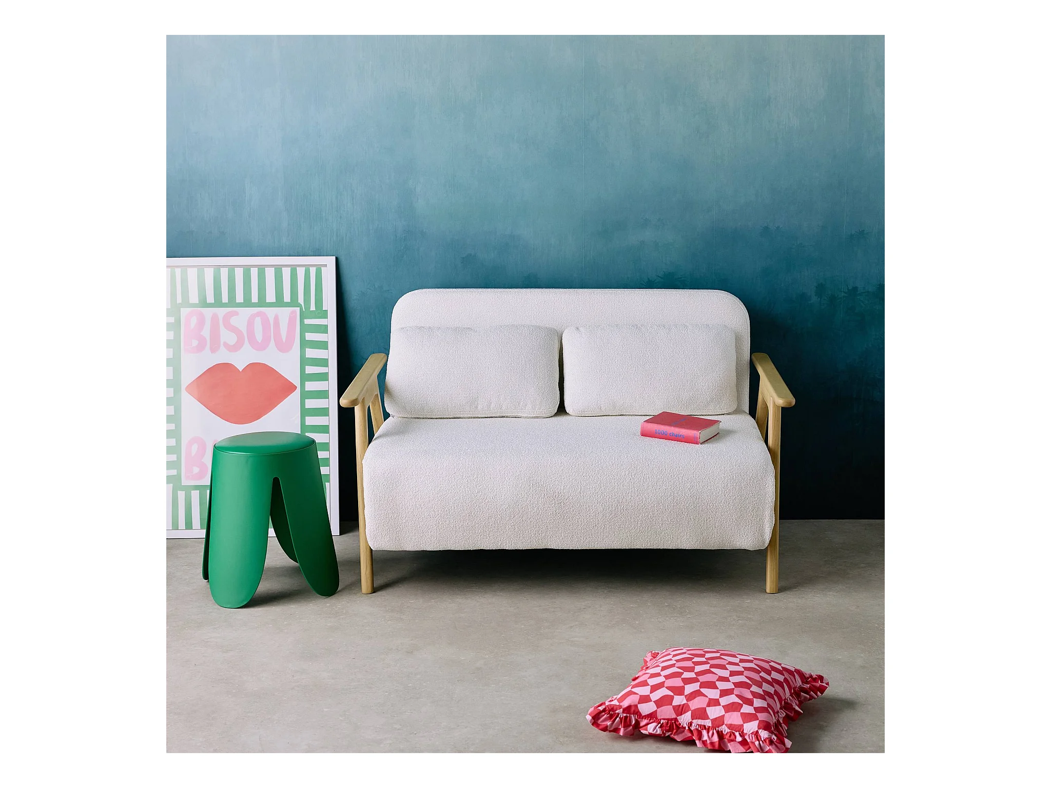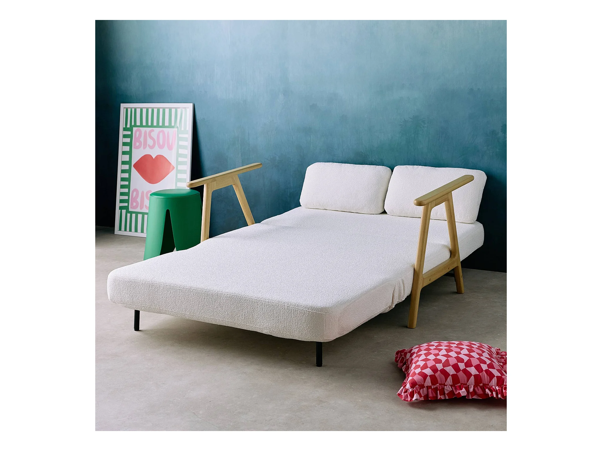 Banquette canapé convertible 2 places bois d'hévéa et bouclette texturée crème L 133 x P 81 x 84cm - Sven