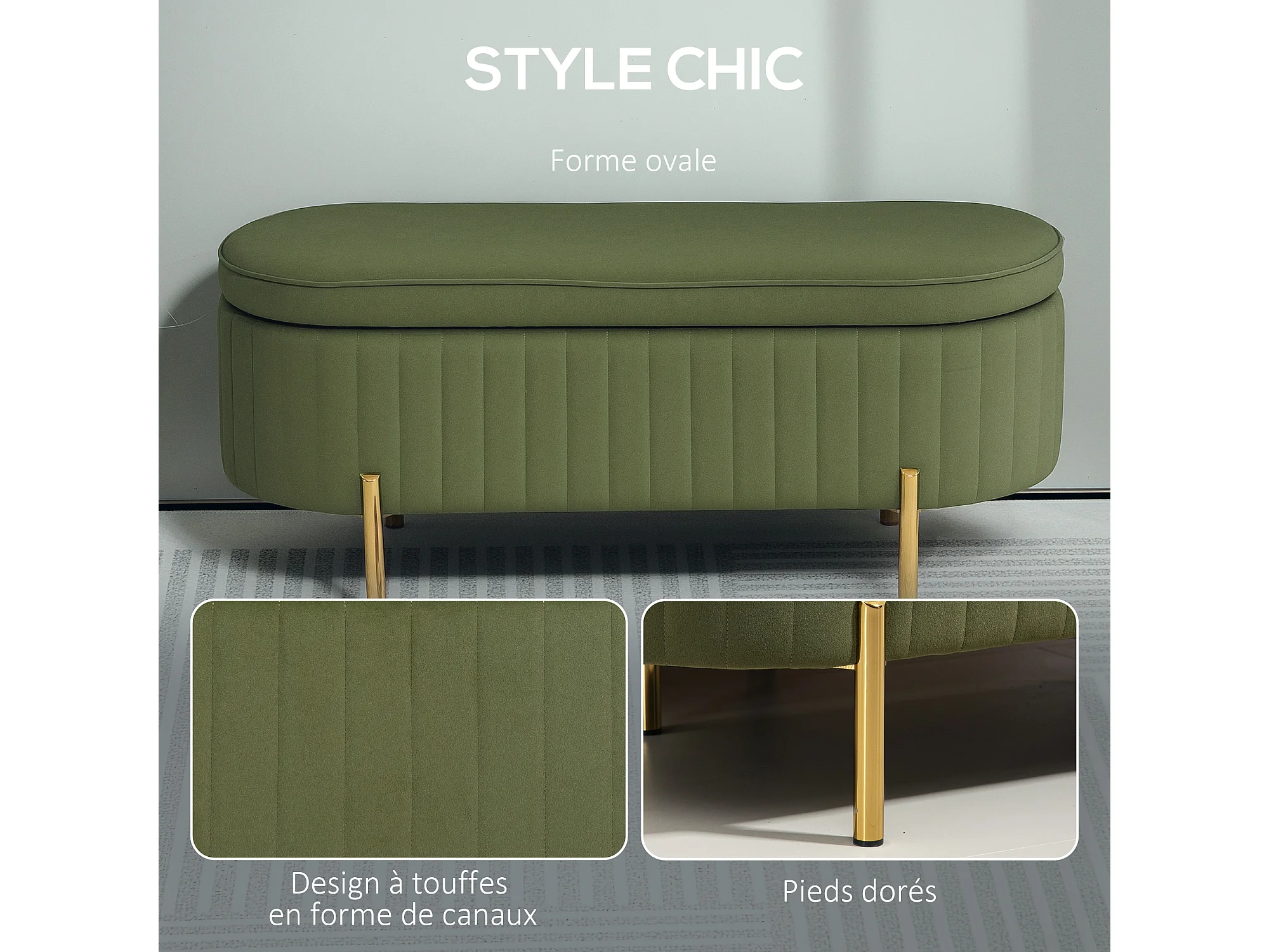 Banquette coffre 2 en 1 design ovale dim. 108x44x43cm velours kaki