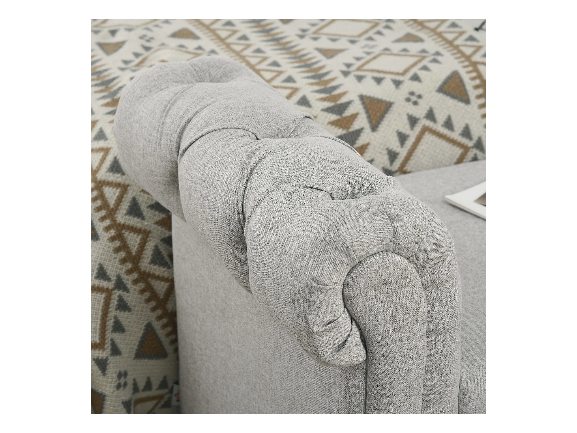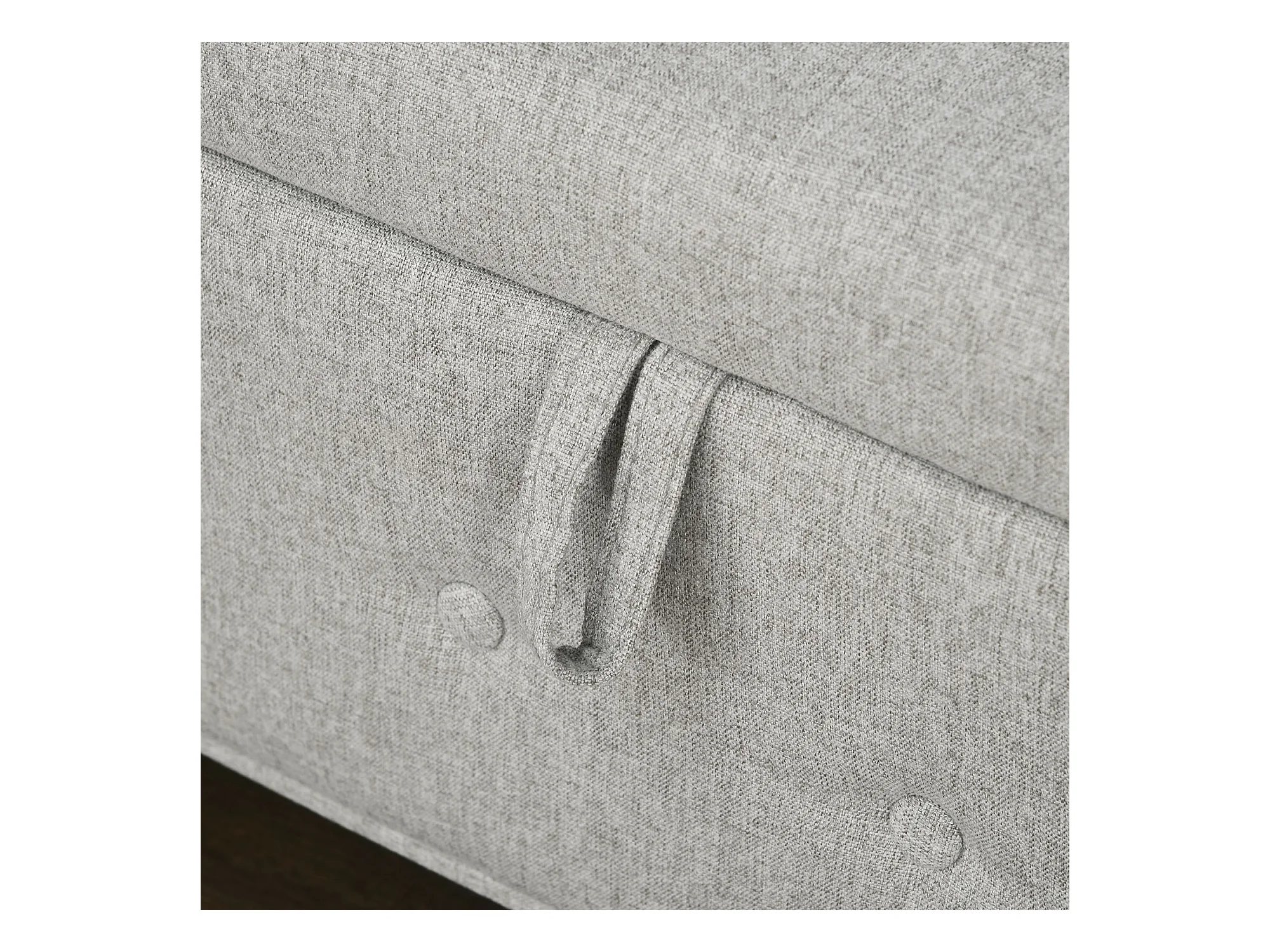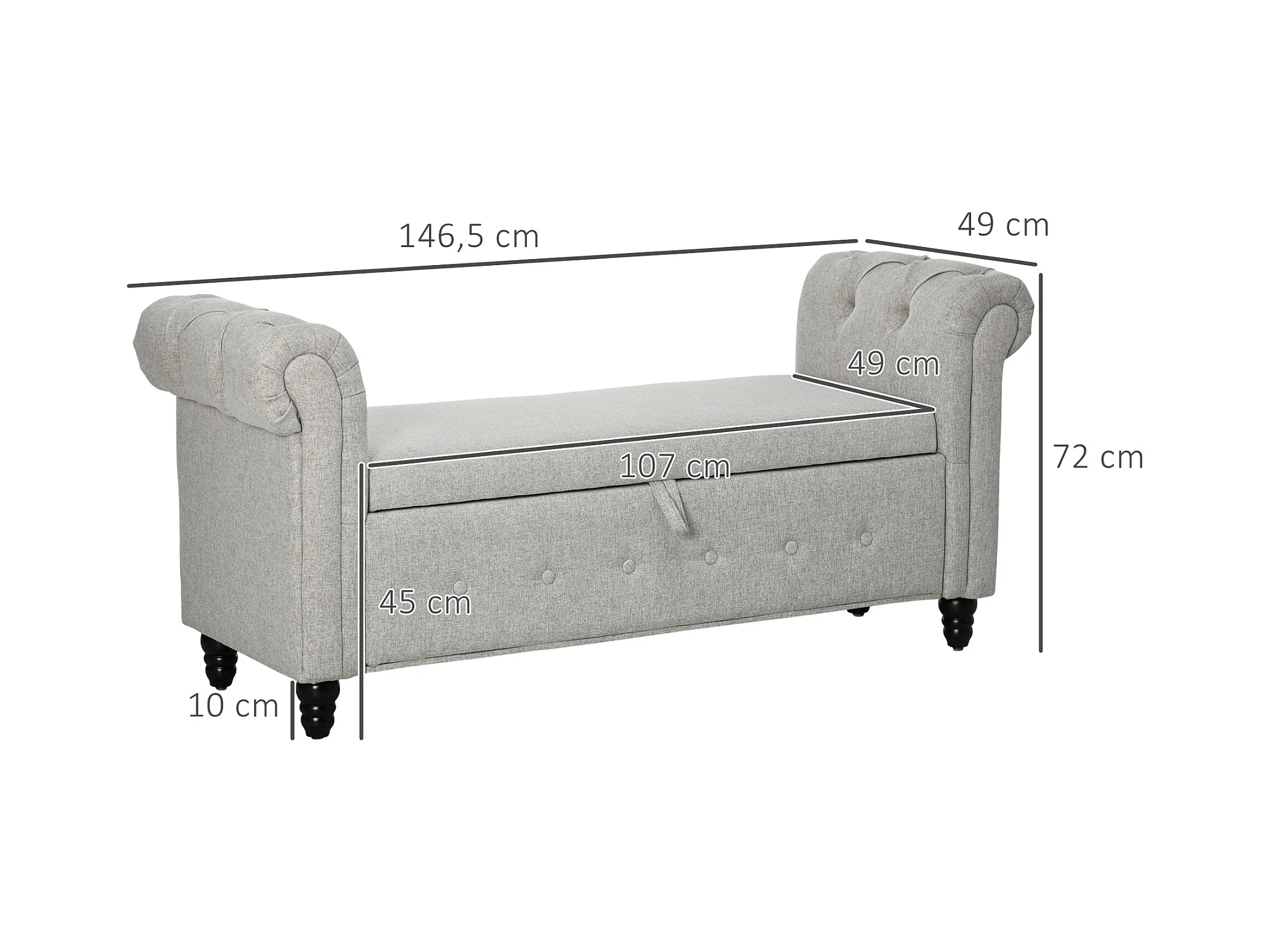 Banquette coffre de rangement 2 en 1 design Chesterfield accoudoirs courbés capitonnés piètement bois noir aspect lin gris