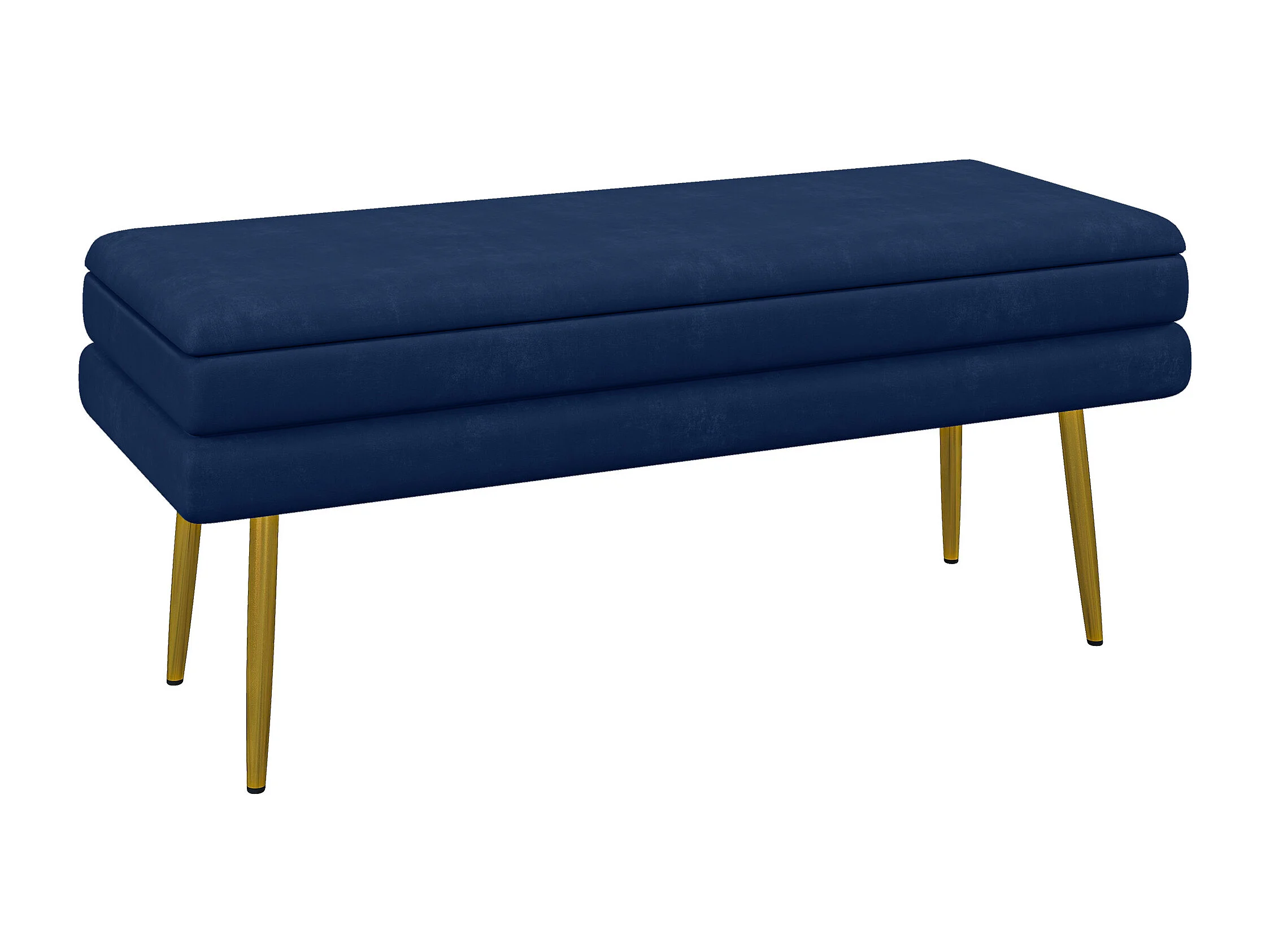 Banquette coffre de rangement 2 en 1 piètement effilé incliné acier doré velours bleu marine