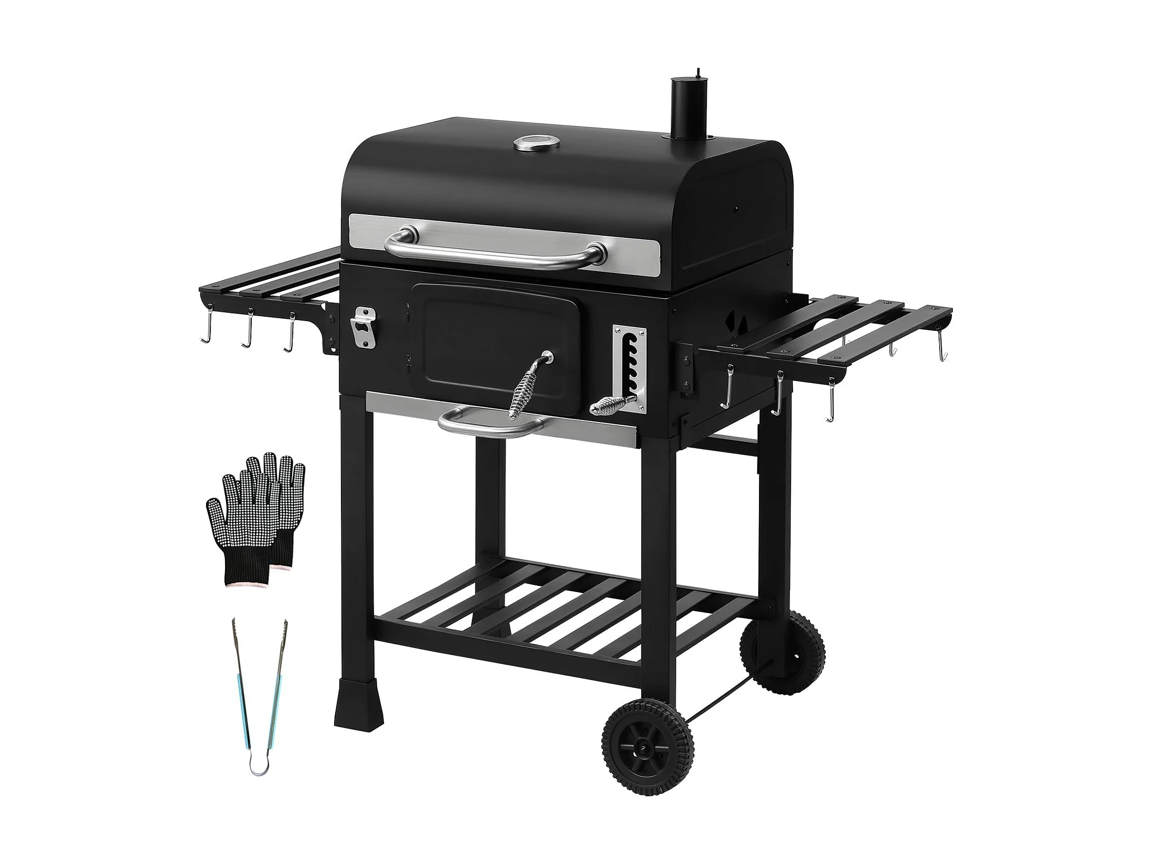 Gril à charbon de bois, gril à charbon de bois XXL avec couvercle, thermomètre, tiroir à cendres, gants anti-brûlure, évents réglables