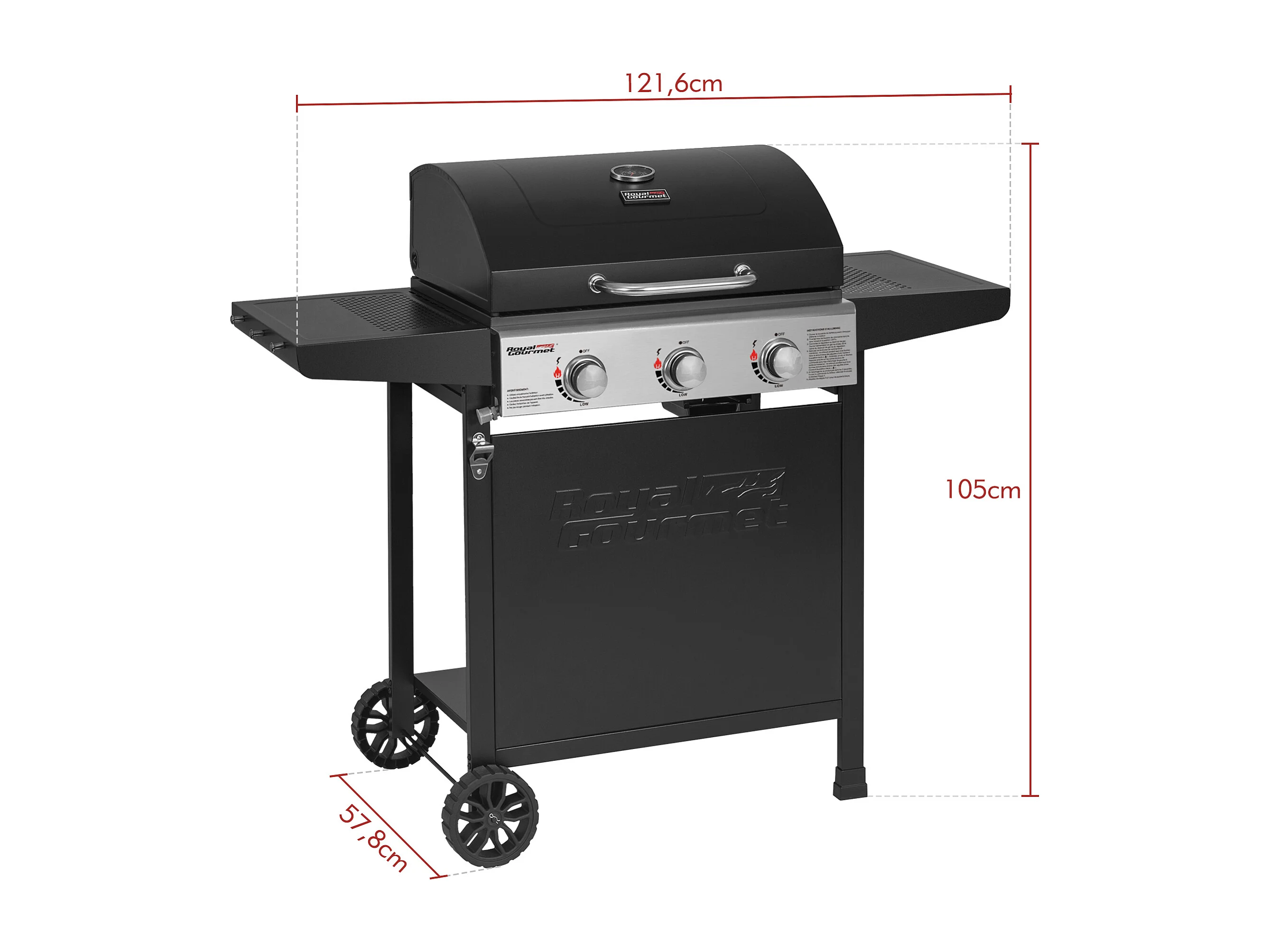 Barbecue Gaz sur Chariot Royal Gourmet à 3 Brûleurs - Puissance 9kW - Noir - 121,6 x 57,8 x 105 cm