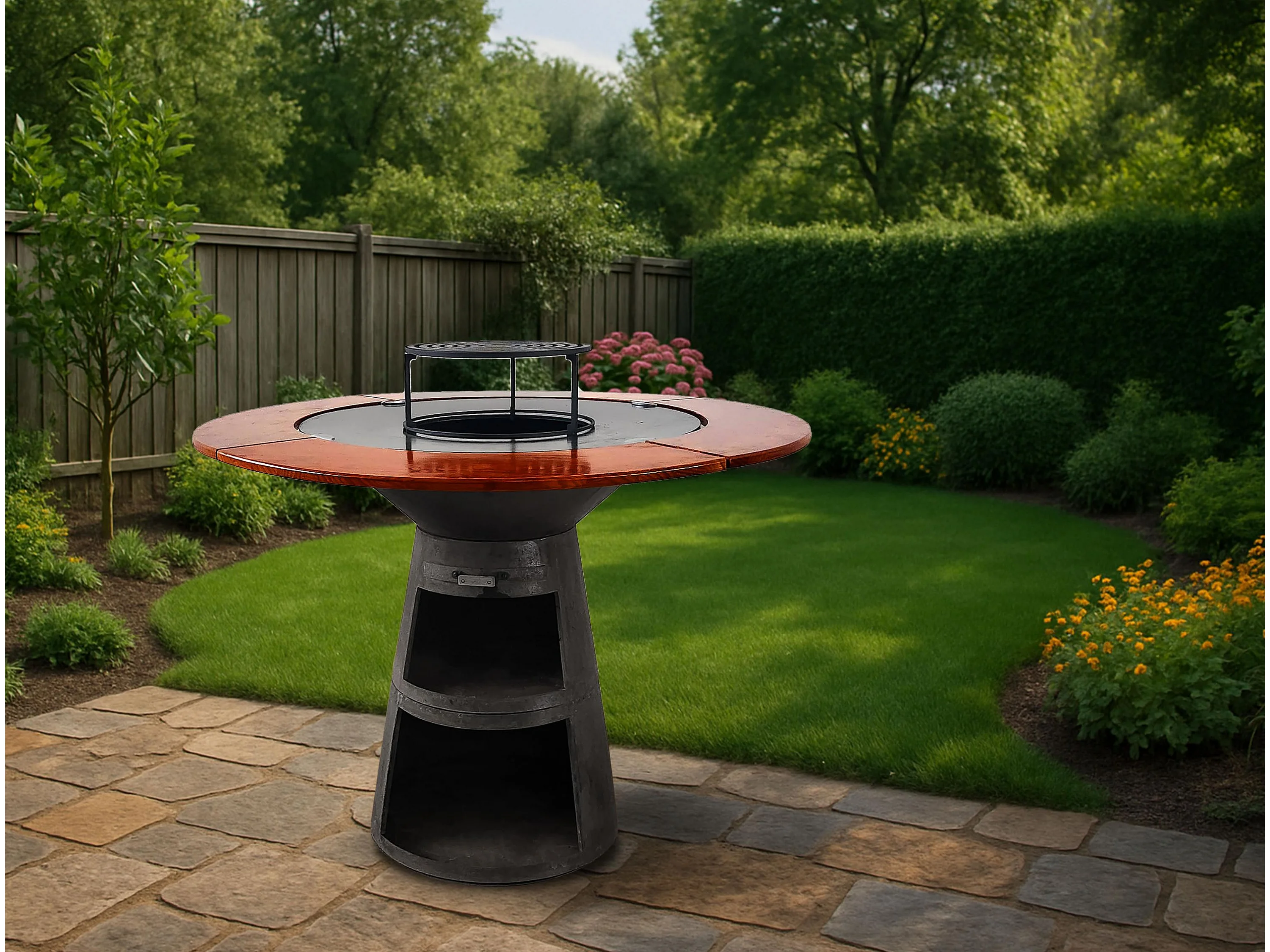 Barbecue rond avec plaque de cuisson et de gril en acier et planche en bois