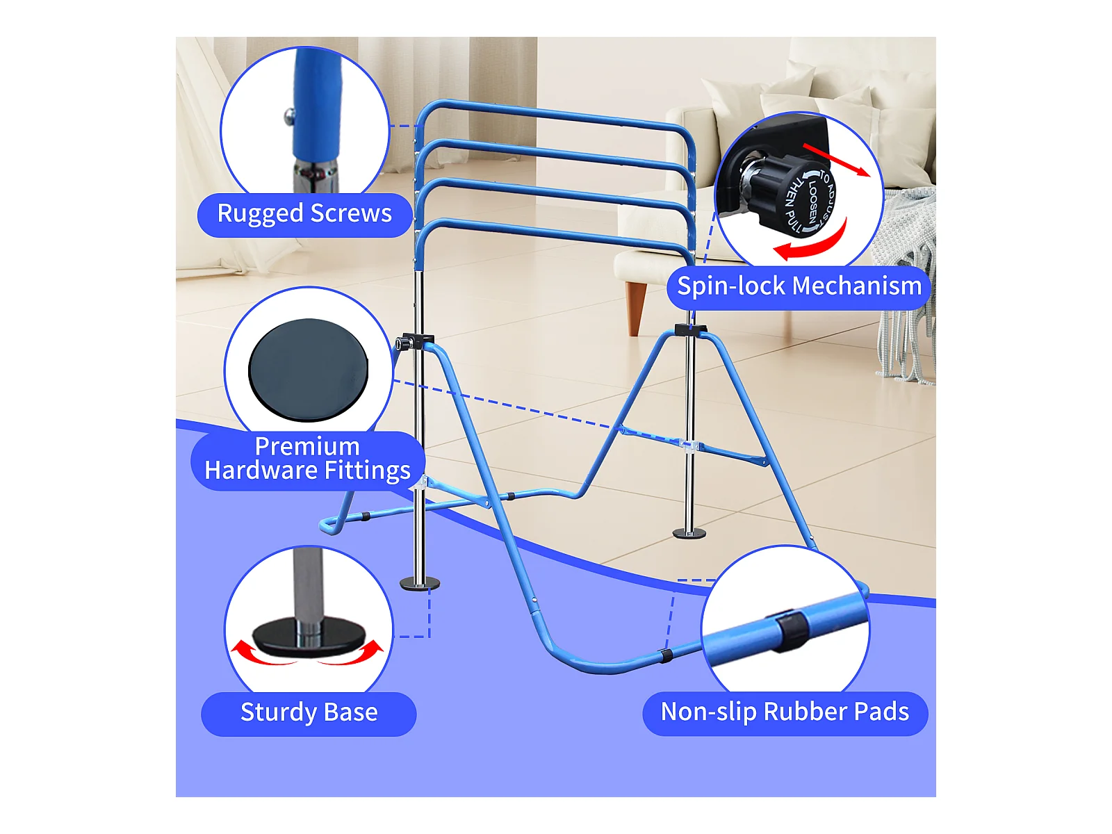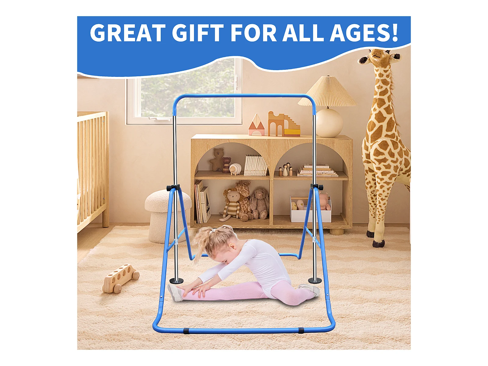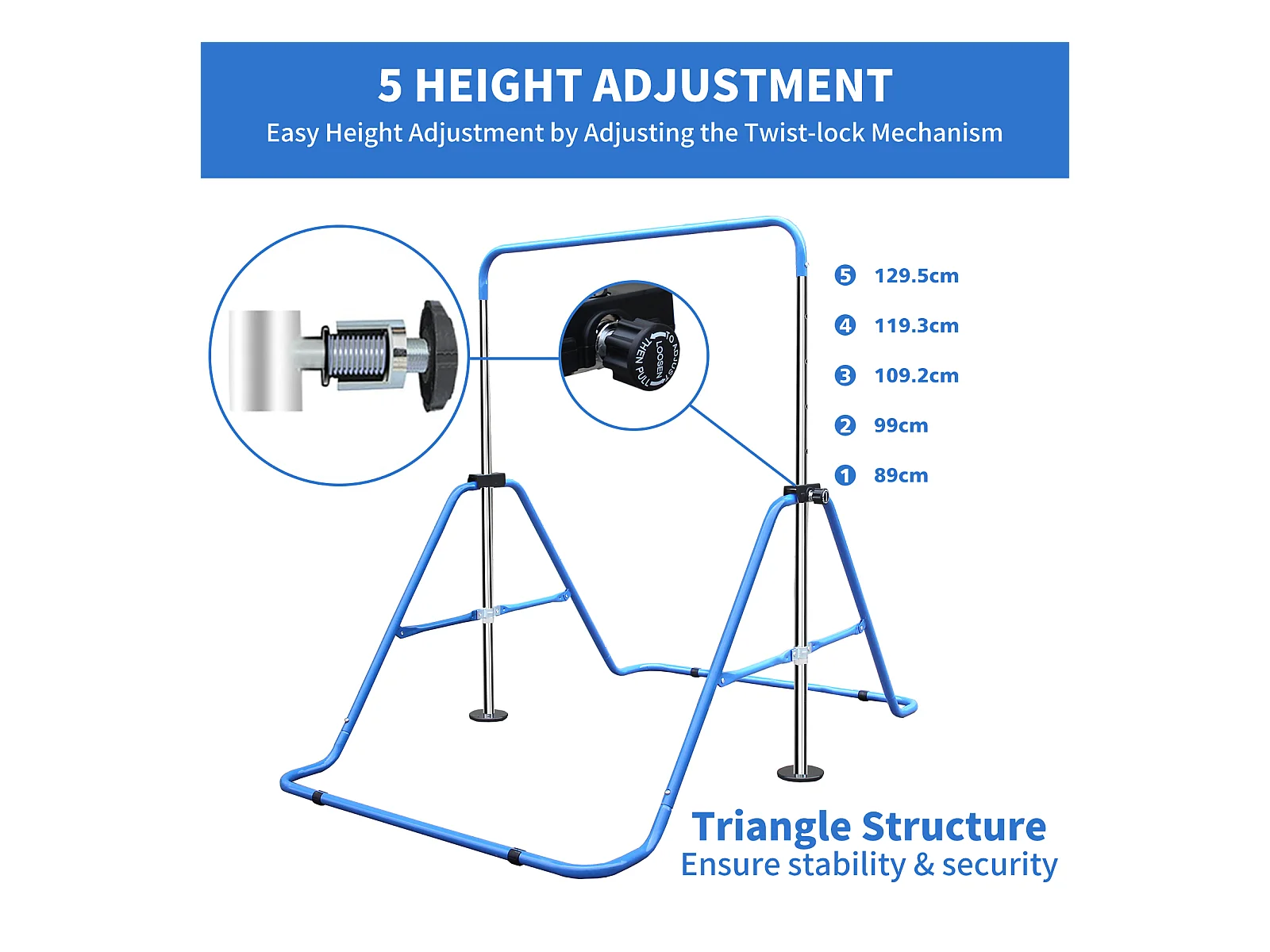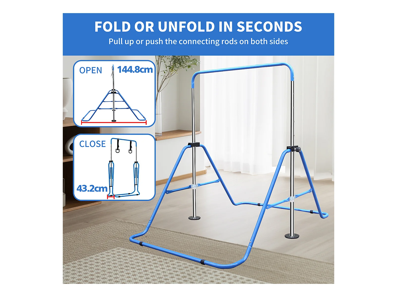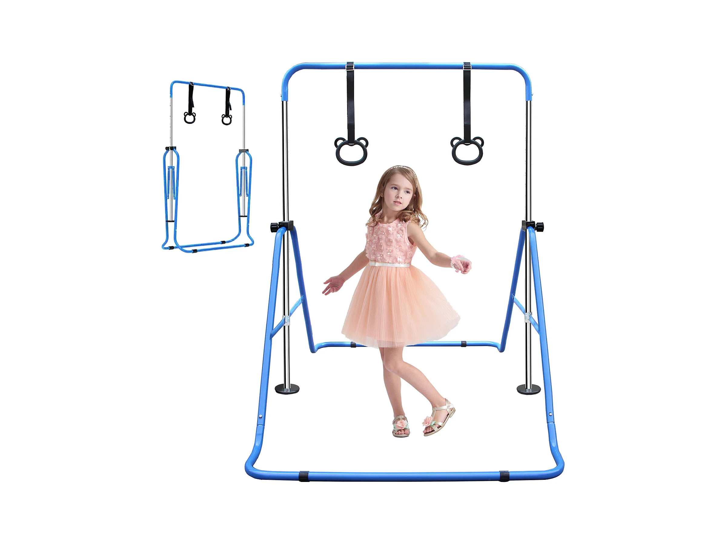 Barre de gymnastique extensible pour enfants, réglable en hauteur, pliable, acier, bleu (145x100x130 cm)