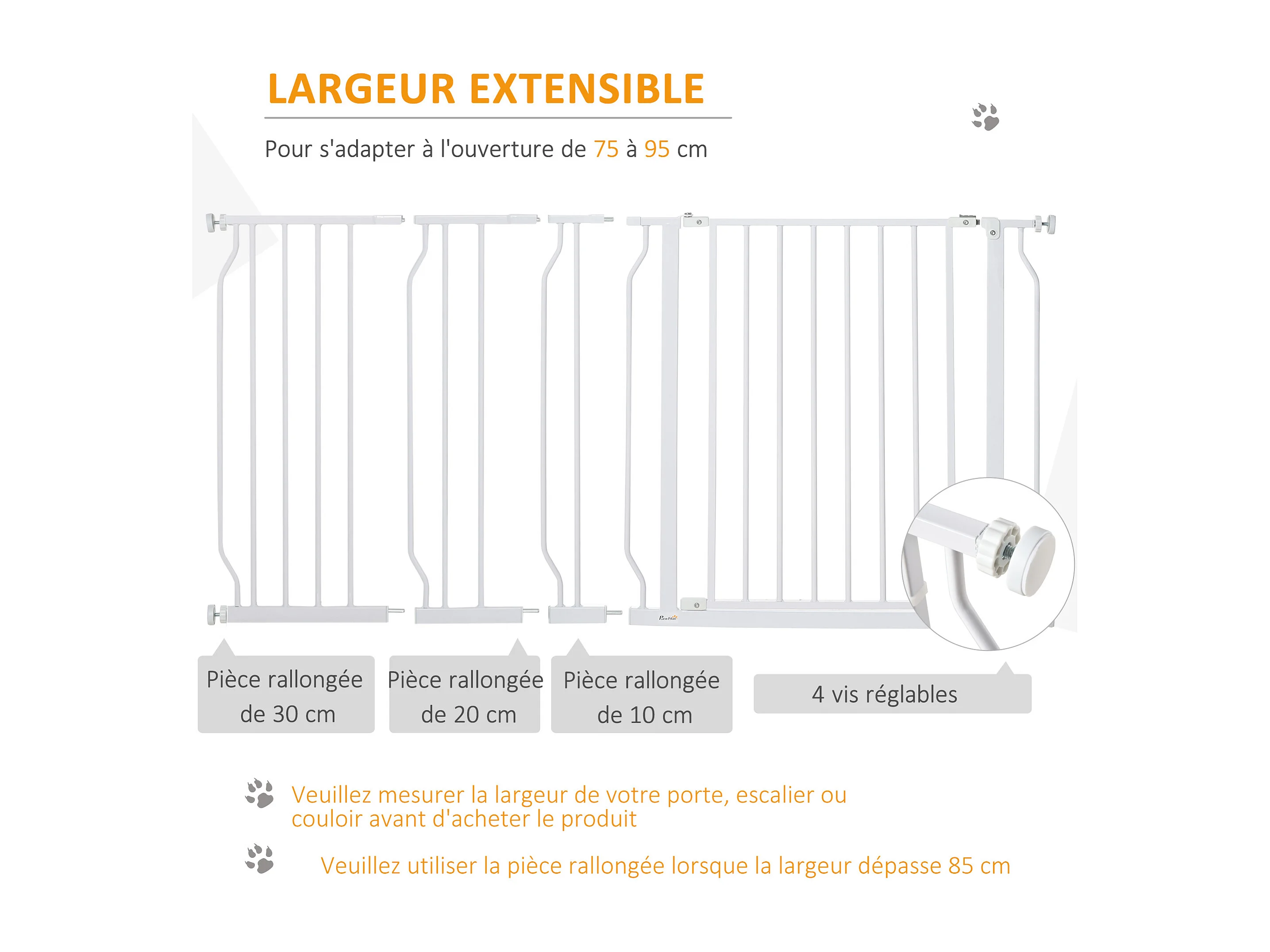 Barrière de sécurité animaux réglable 76-103L cm - porte 2 verrouillages, ouverture 2 sens - acier ABS blanc