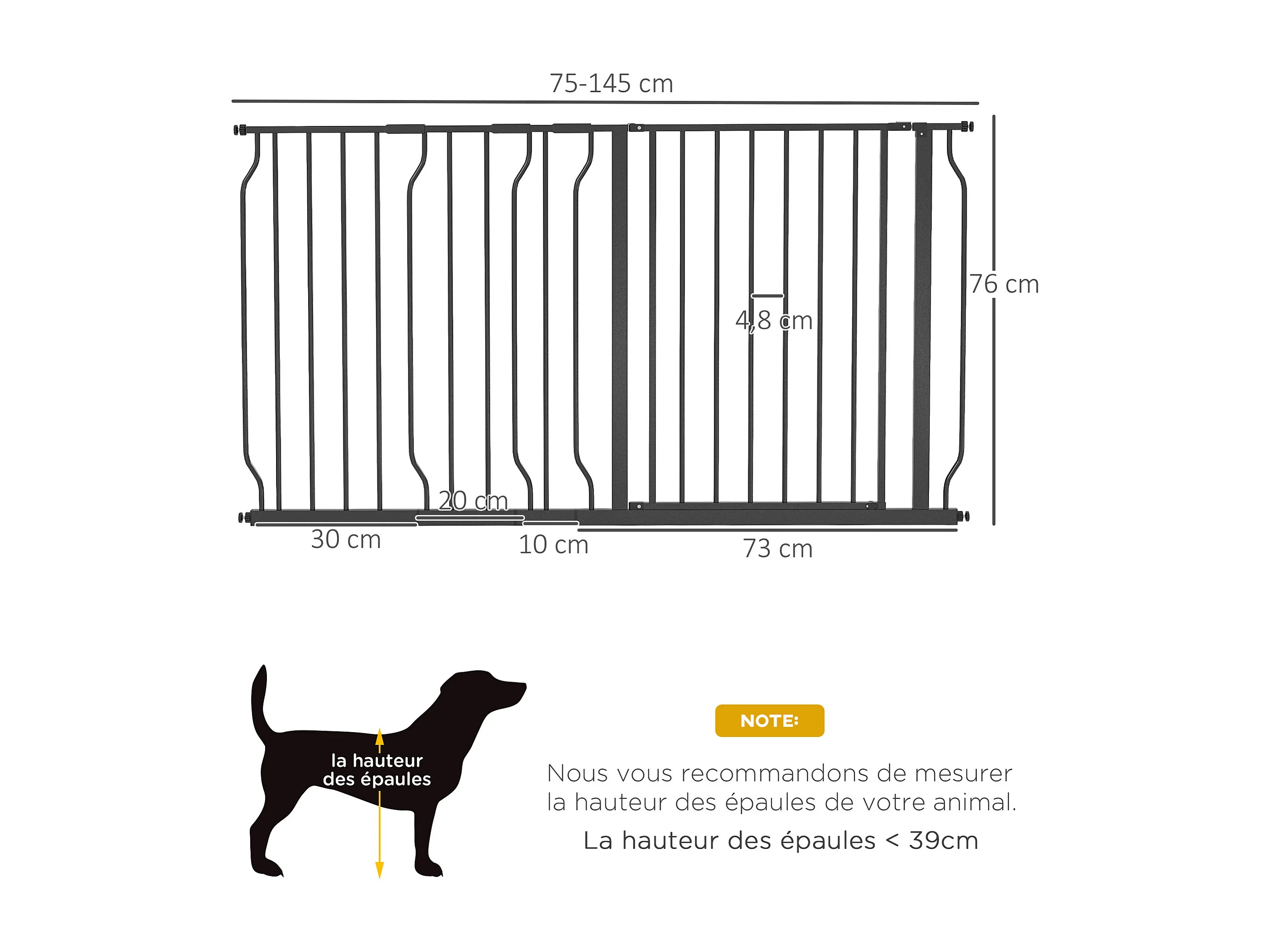 Barrière de sécurité animaux - longueur réglable dim. 75-145 cm - porte double verrouillage, ouverture double sens -sans perçage - acier ABS noir