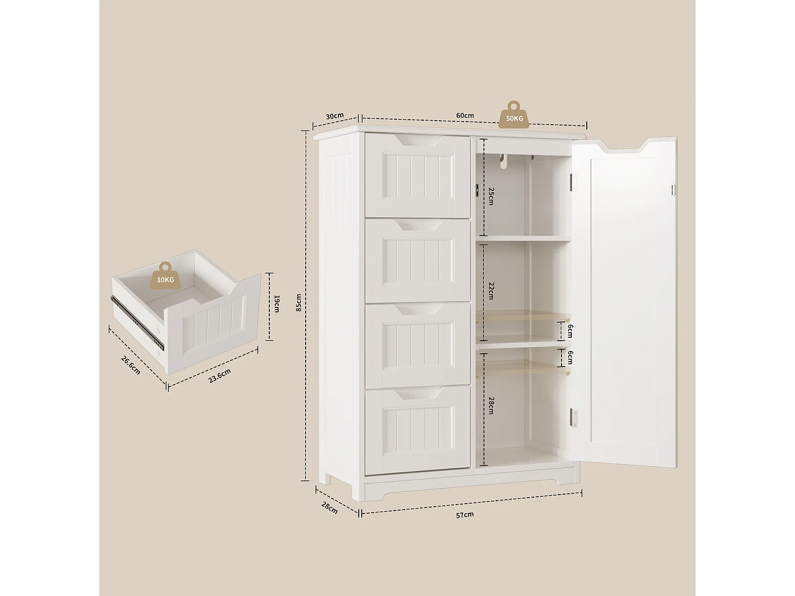 Bealife Meuble Salle de Bain Petit Meuble de Rangement Sur Pied 4 Tiroirs 28 x 28 x 84 cm Bas Commode SDB Armoire Blanc