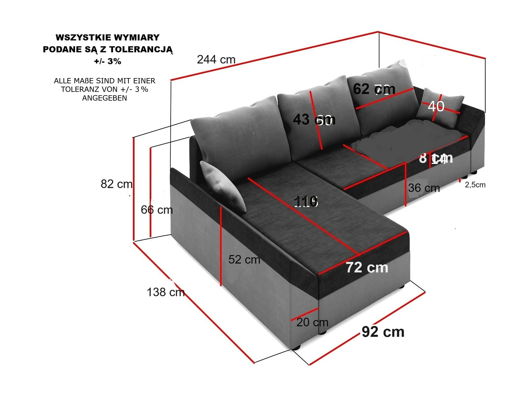 BEDANTE Canapé d’angle DANTE L gauche Rainbow 15 + 31 Noir/Blanc Forme L