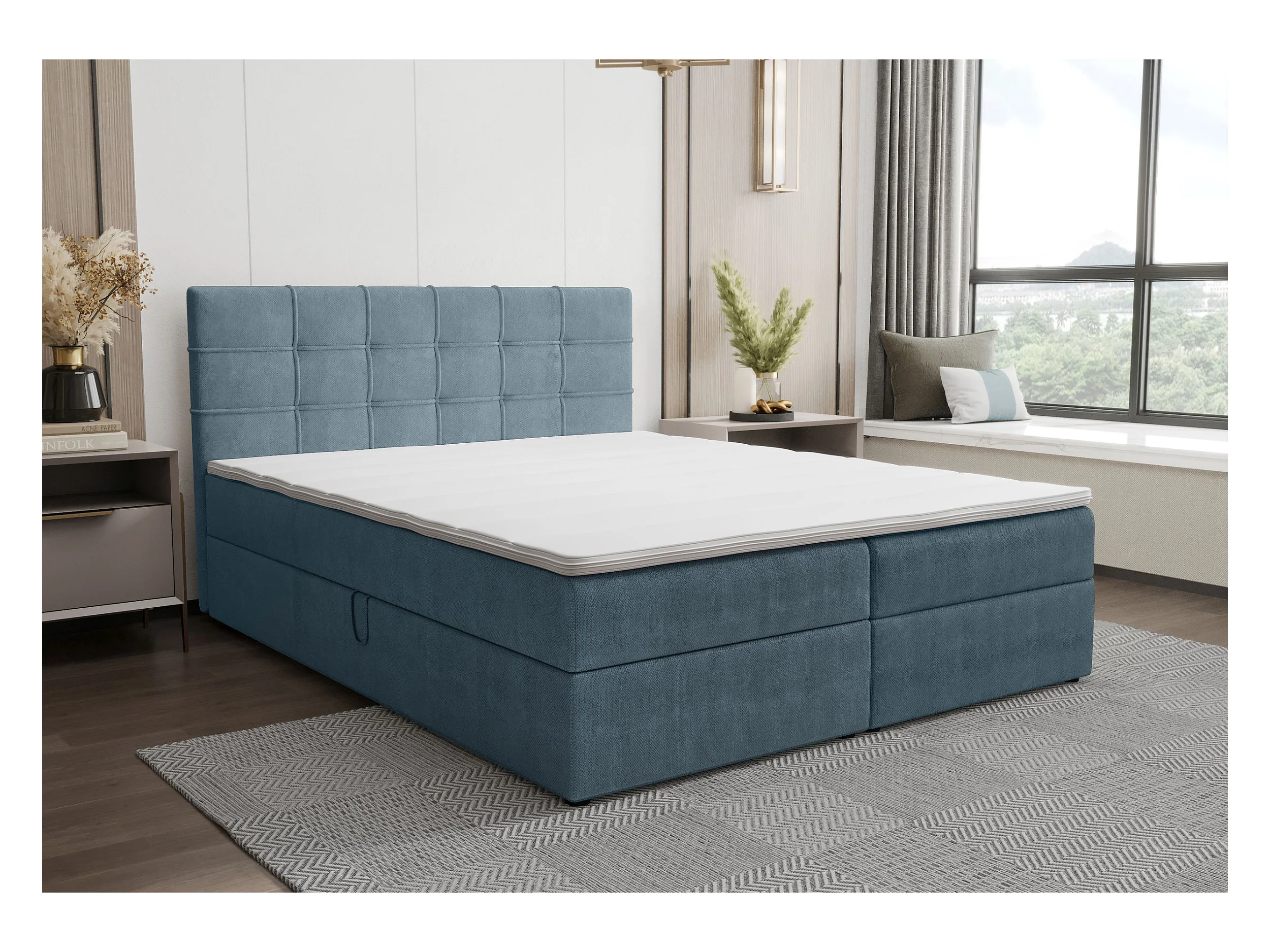 BEDANTE Lit boxspring KIDA 140x200 Curio 74 Bleu Lit Litkasten Lit double Lit d'hôtel Chambre à coucher Espace de rangement