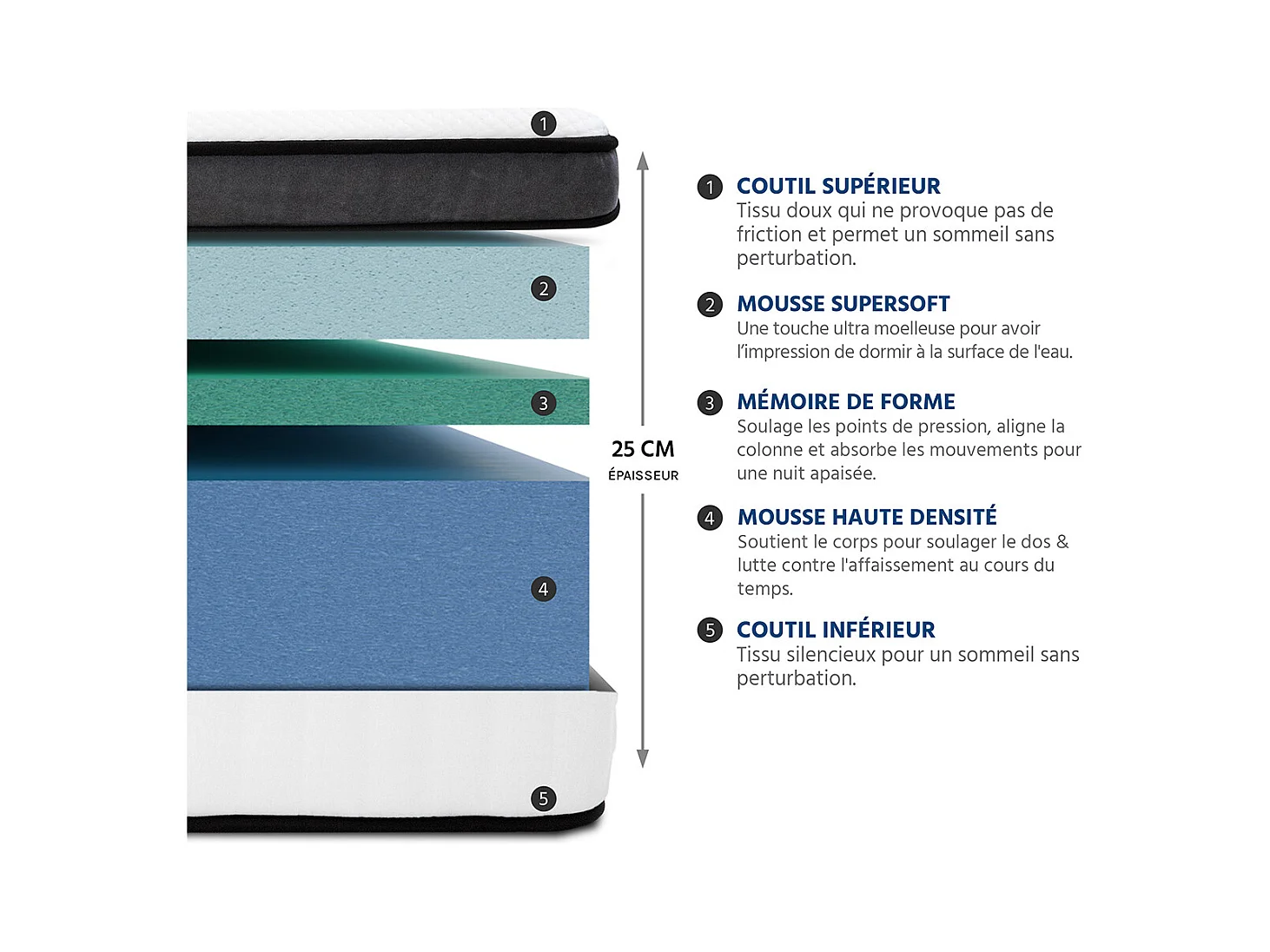 BELLECOUR LITERIE | Pack TIVOLI 160x200 cm | Matelas Mémoire de forme + Sommier Bois + Protège matelas anti punaise