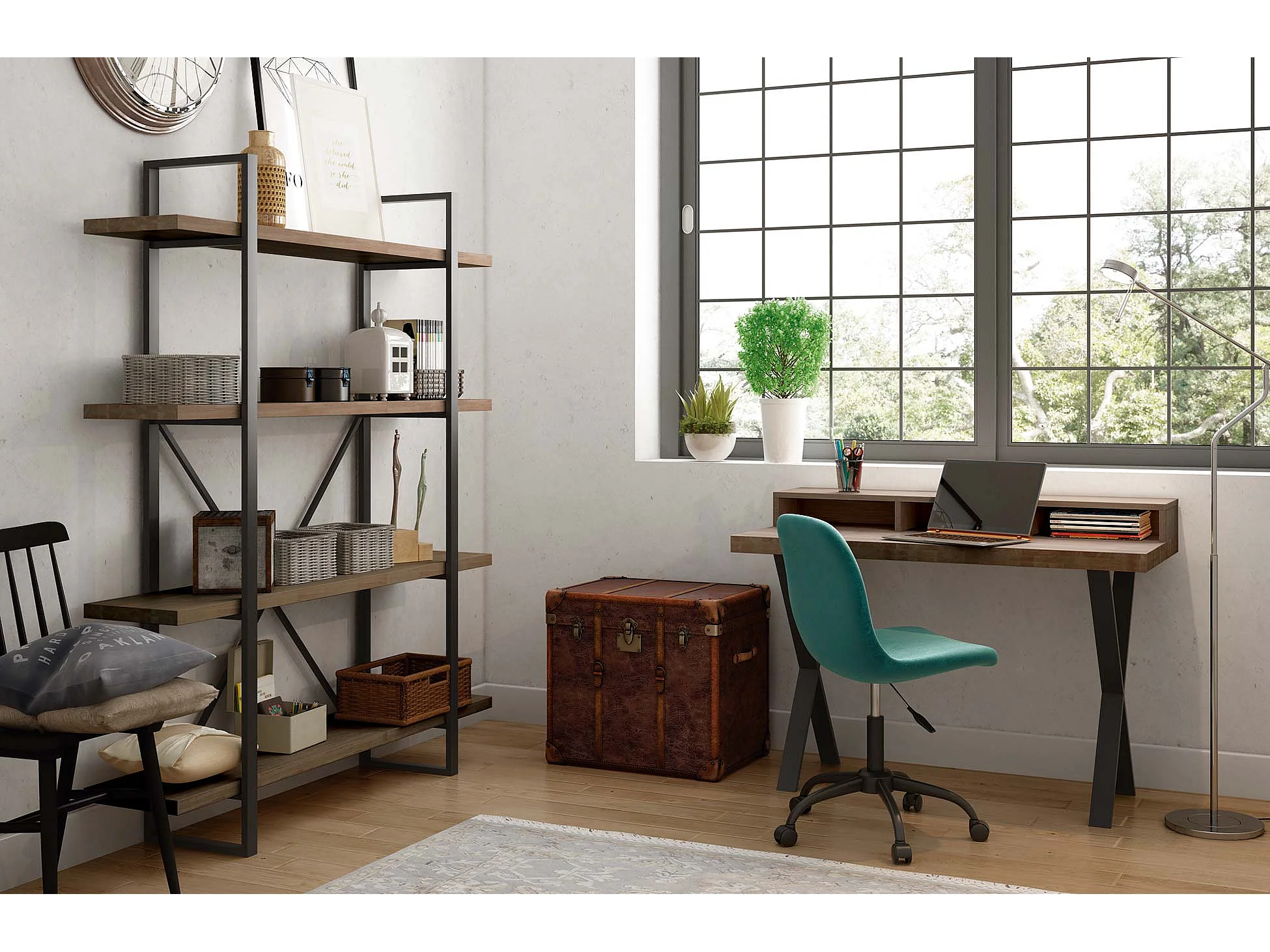 Bibliothèque avec 5 étagères coloris chêne américain / noir - Largeur 150 x Profondeur 35 x Hauteur 180 cm
