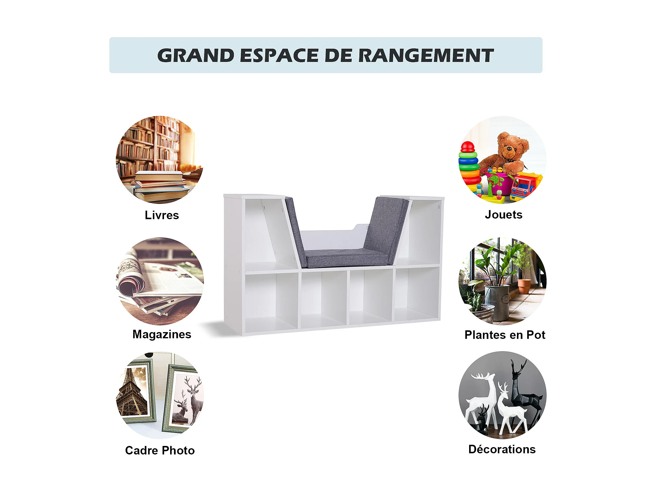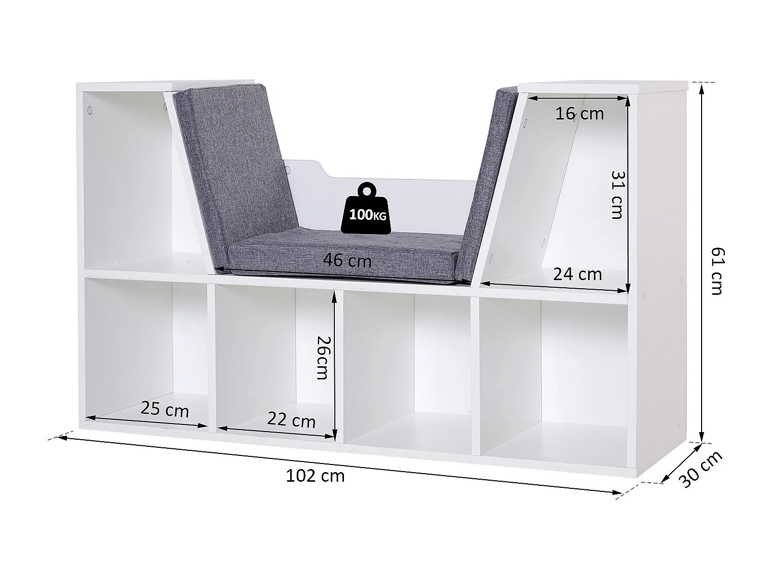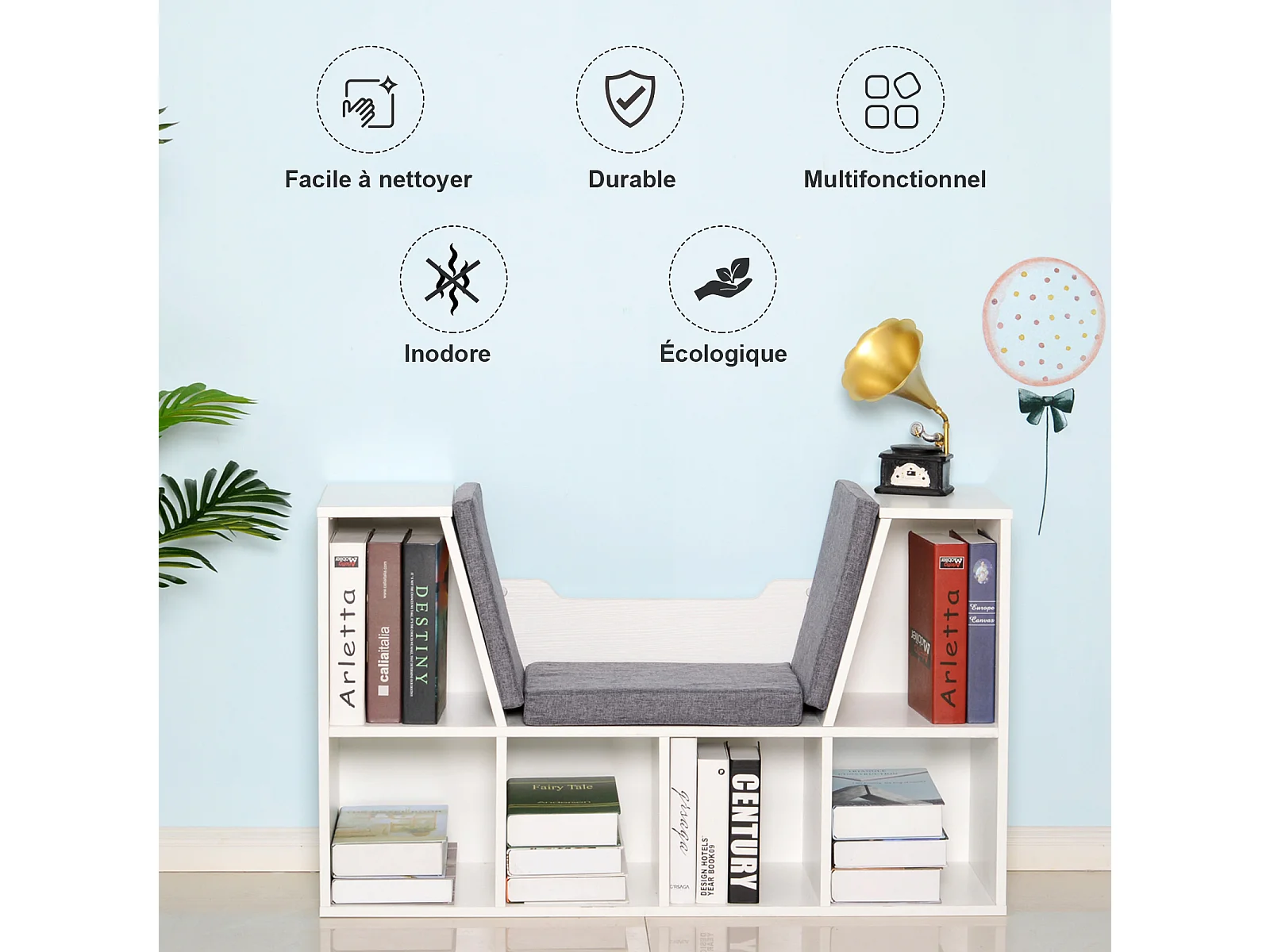 Bibliothèque banc 2 en 1 design contemporain 6 casiers 3 coussins fournis 102L x 30l x 61H cm blanc gris chiné