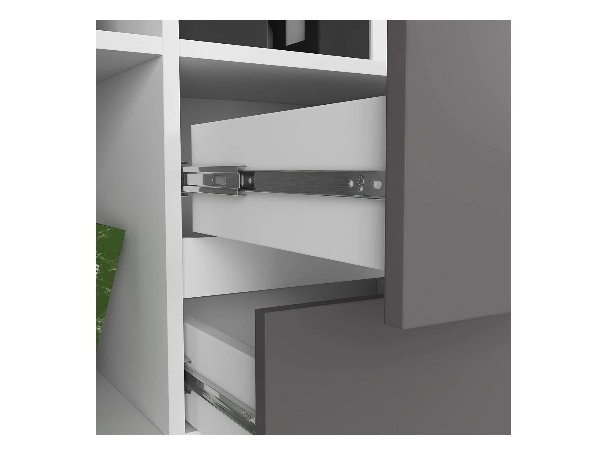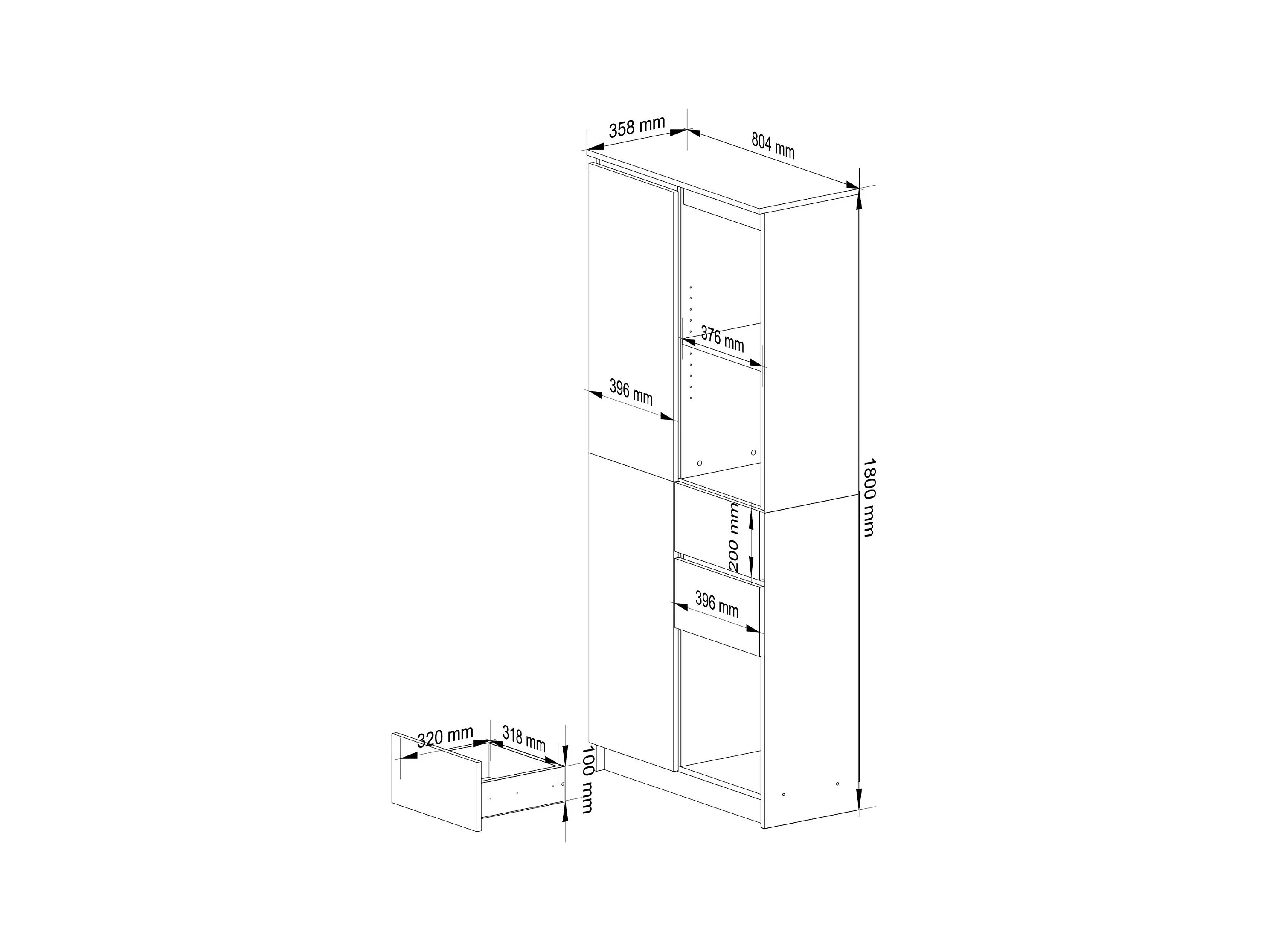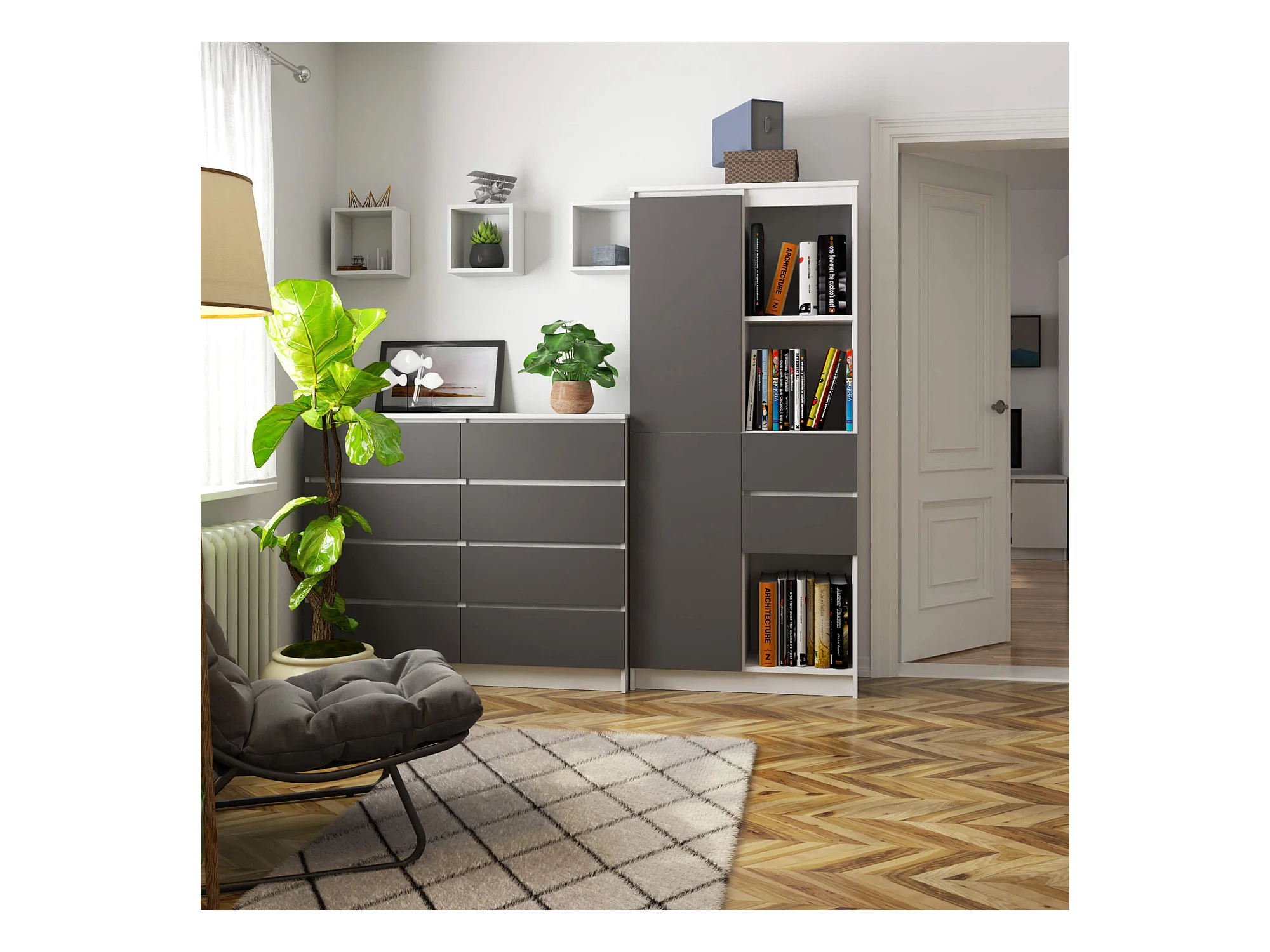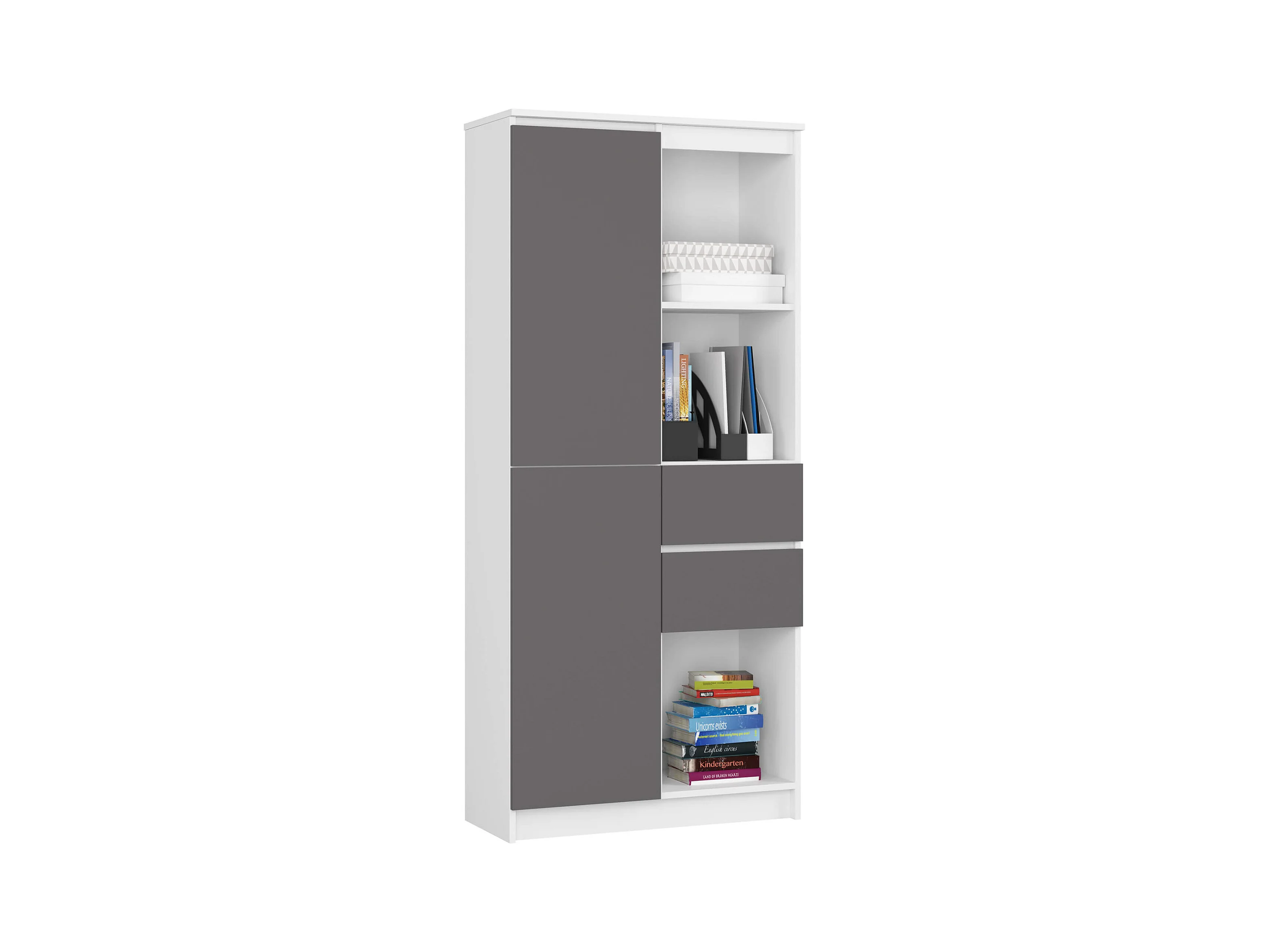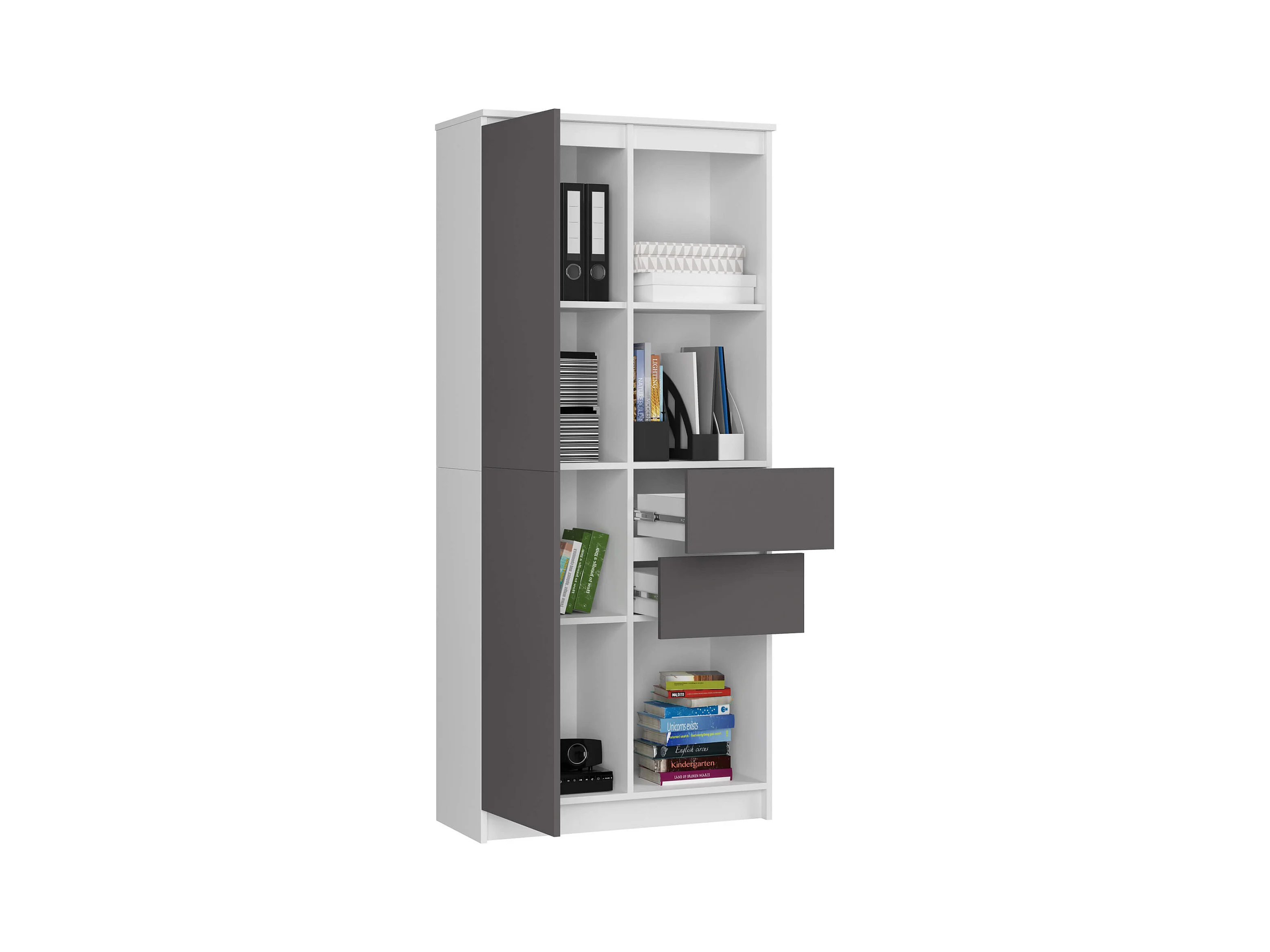 Bibliothèque de bureau AKORD R15 Blanche 80 cm 1 porte 2 tiroirs façade Gris Graphite mat 7 étagères 80x35x180 cm