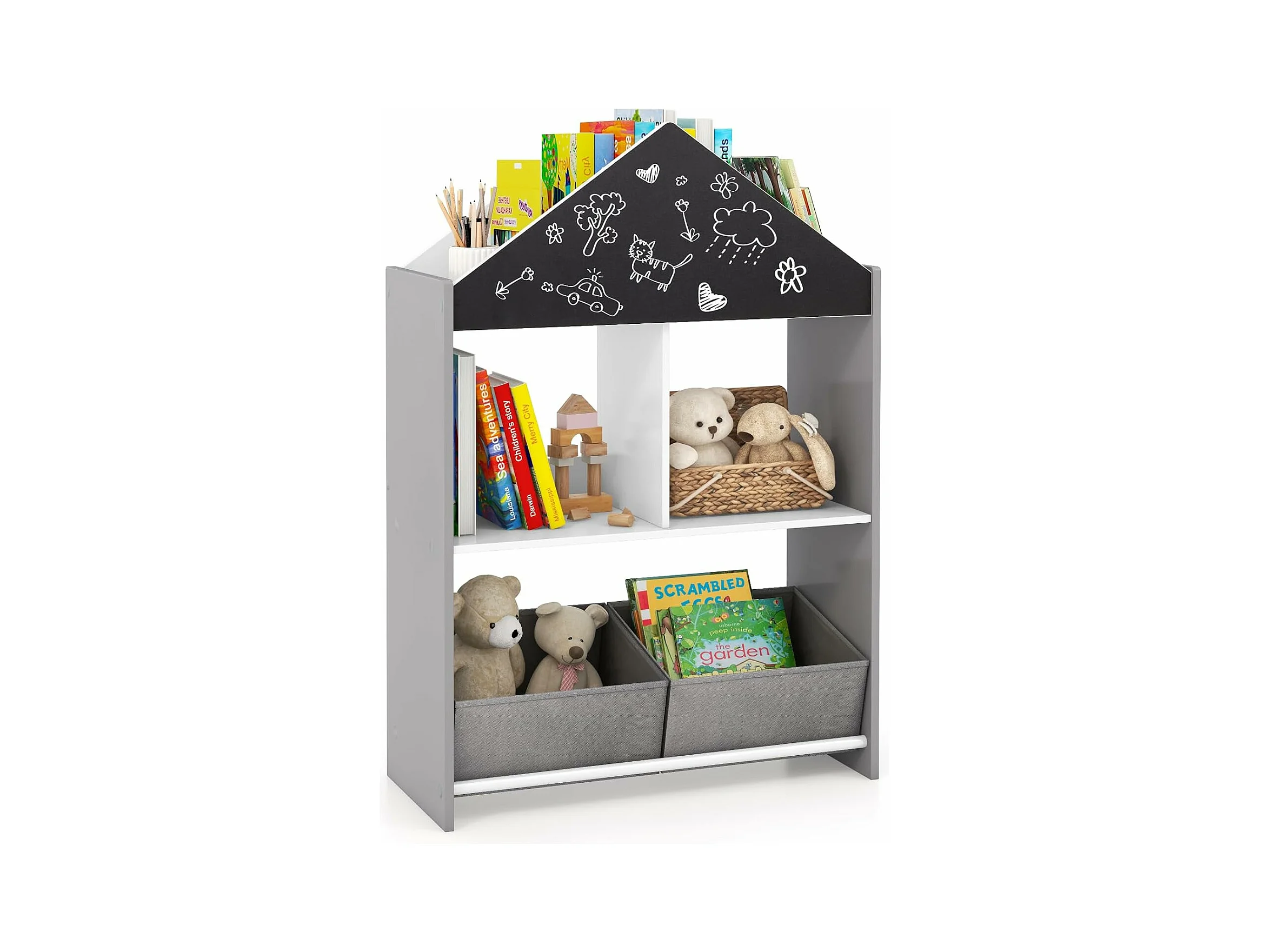 Bibliothèque enfant avec tableau noir & blanc, avec 2 tiroirs en tissu,(gris)