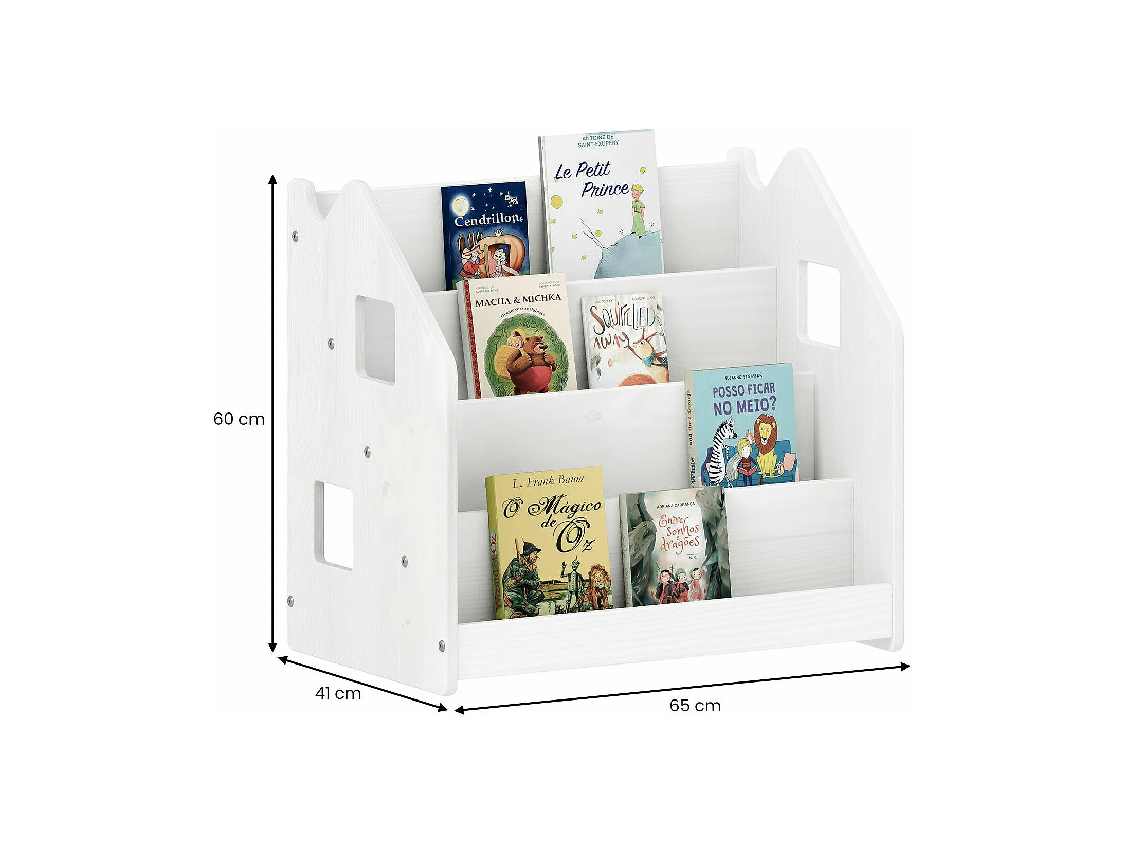 Bibliothèque enfant BRUNO, Rangement livres pour chambre enfant, 4 Compartiments, En pin massif laqué blanc