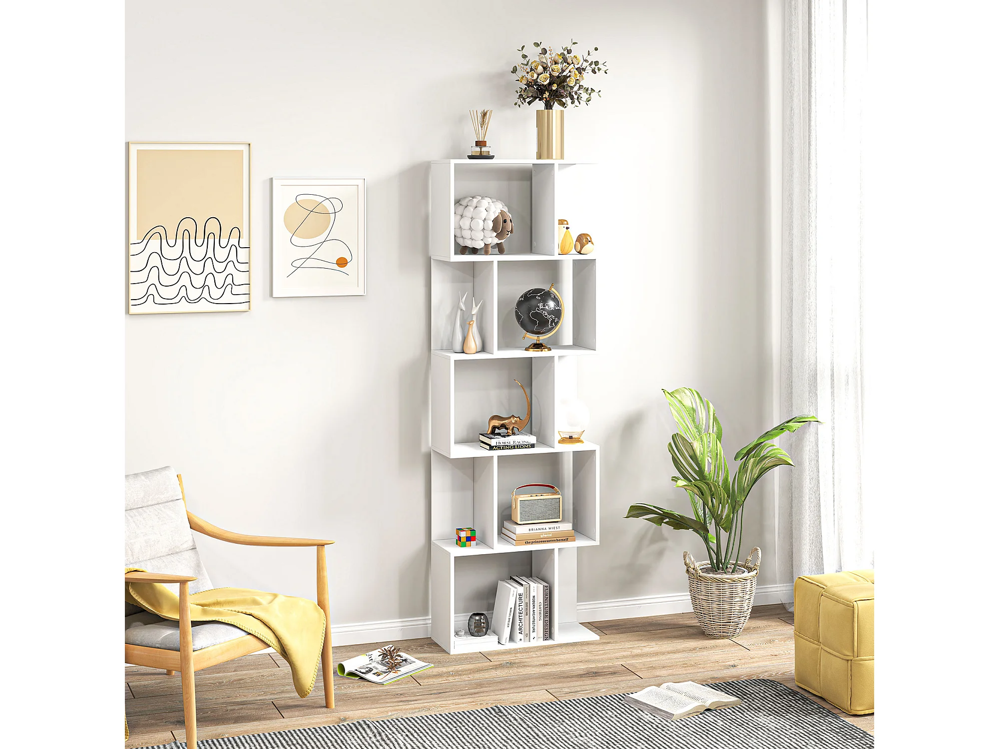 Bibliothèque étagère meuble de rangement design contemporain en S 5 étagères 60L x 24l x 185H cm blanc