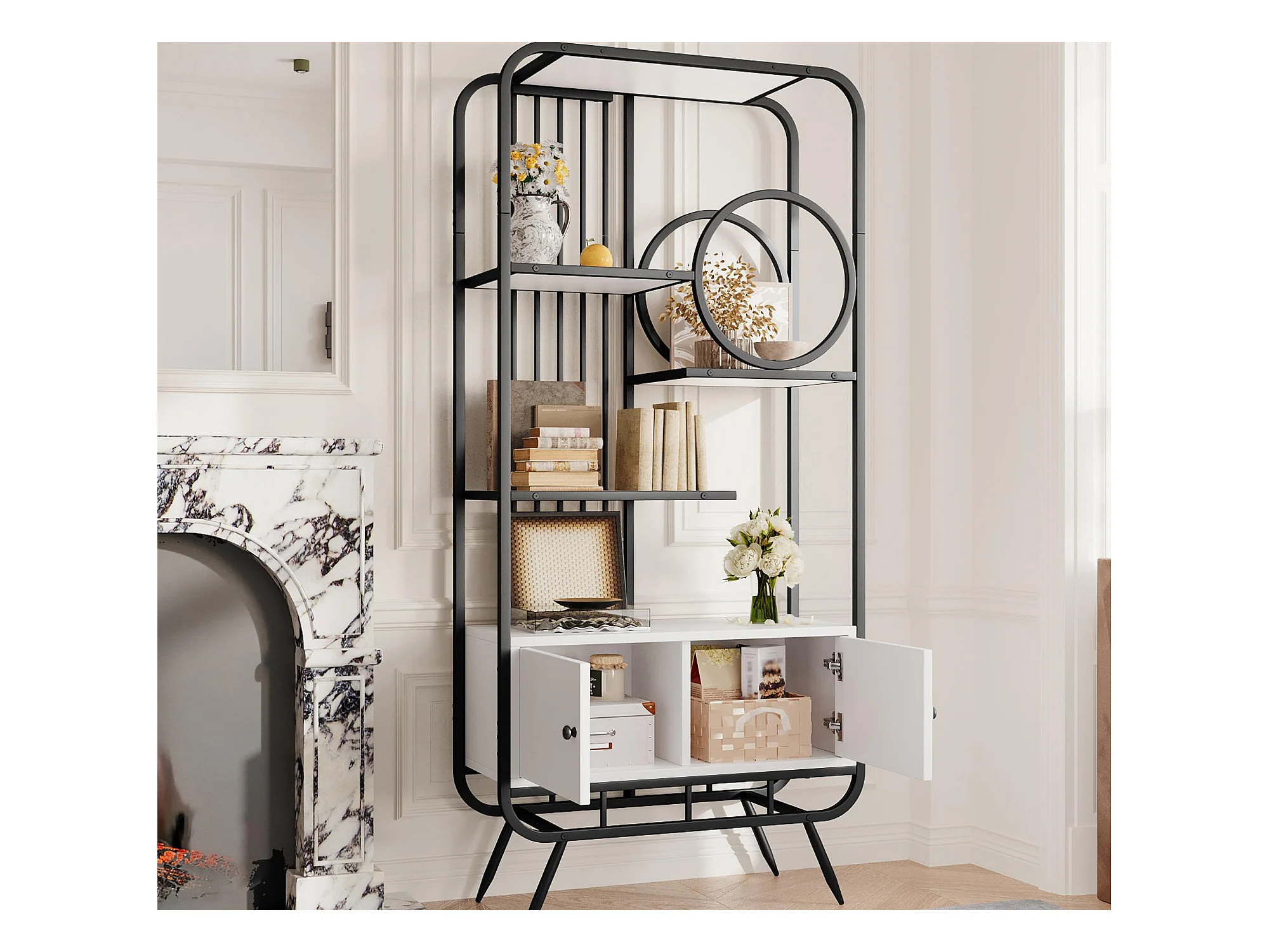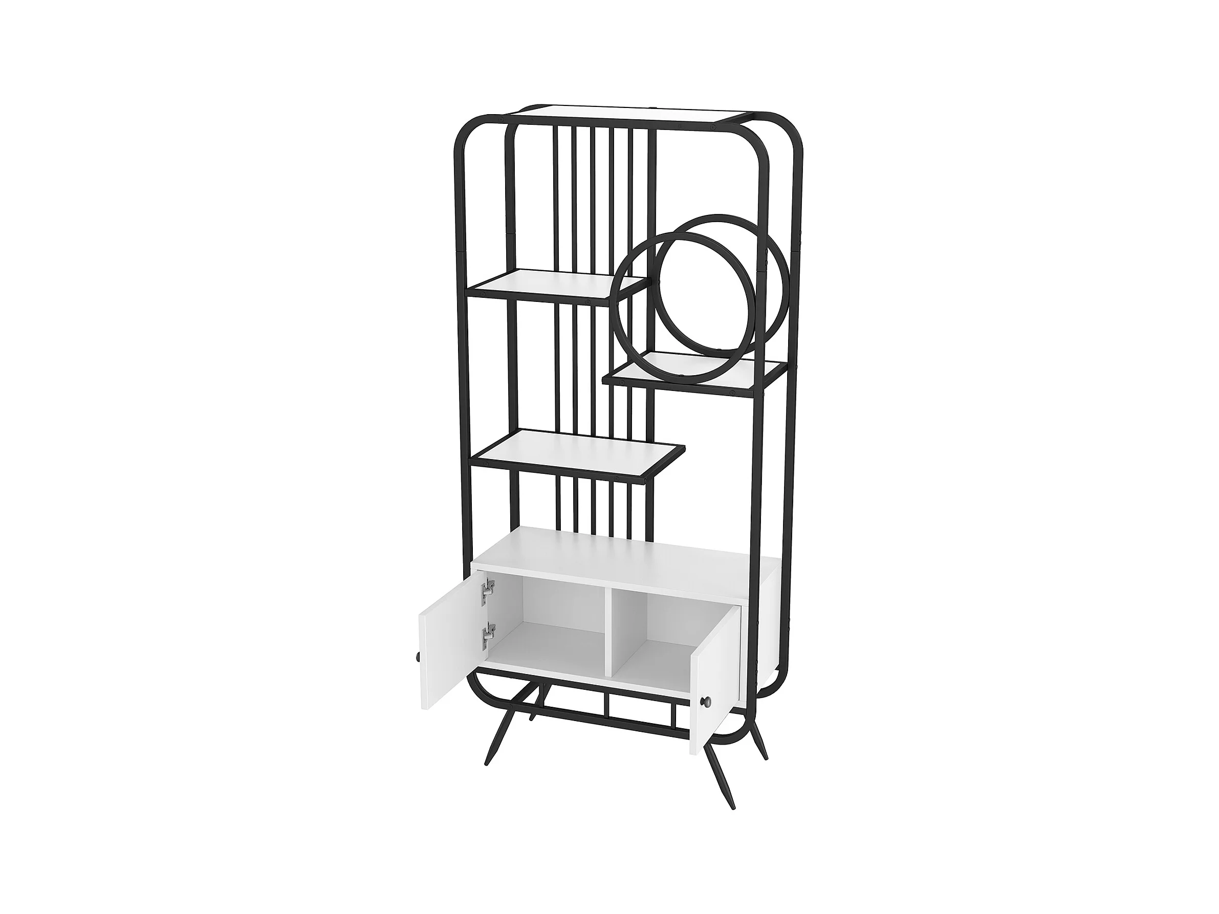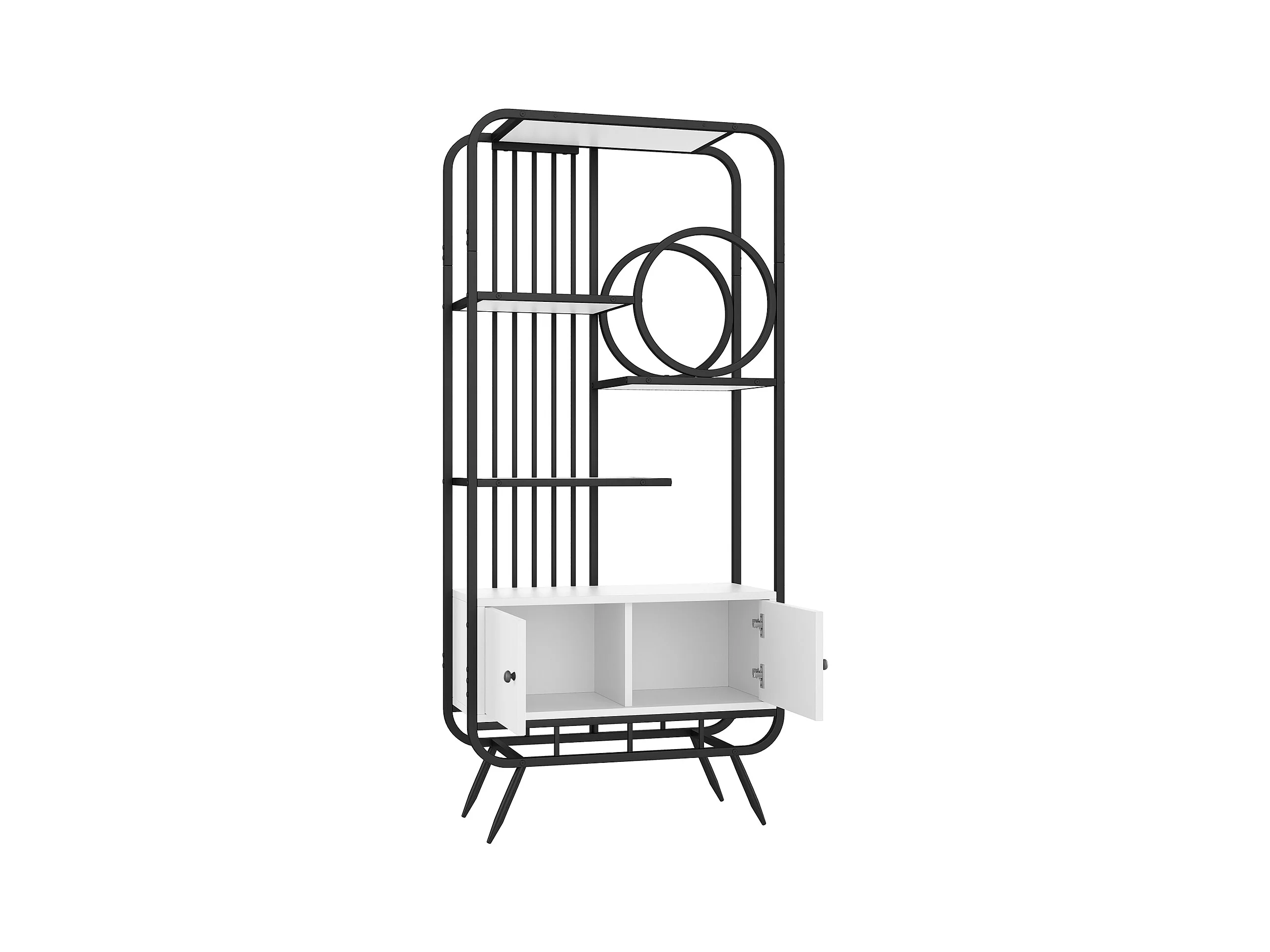 Bibliothèque moderne en métal 80x30x180 cm - meuble de rangement à 2 portes - 3 étagères - décoration ronde - blanc + noir