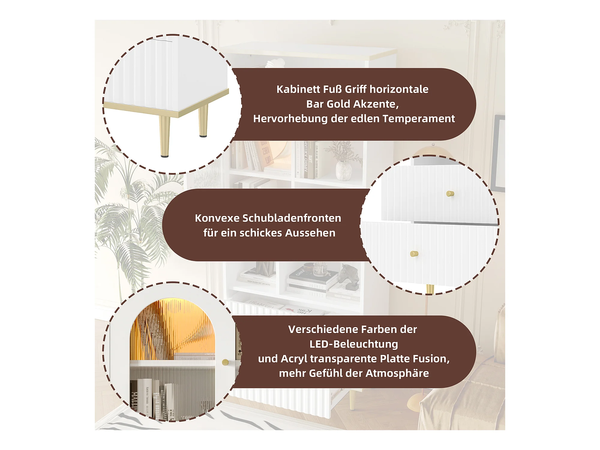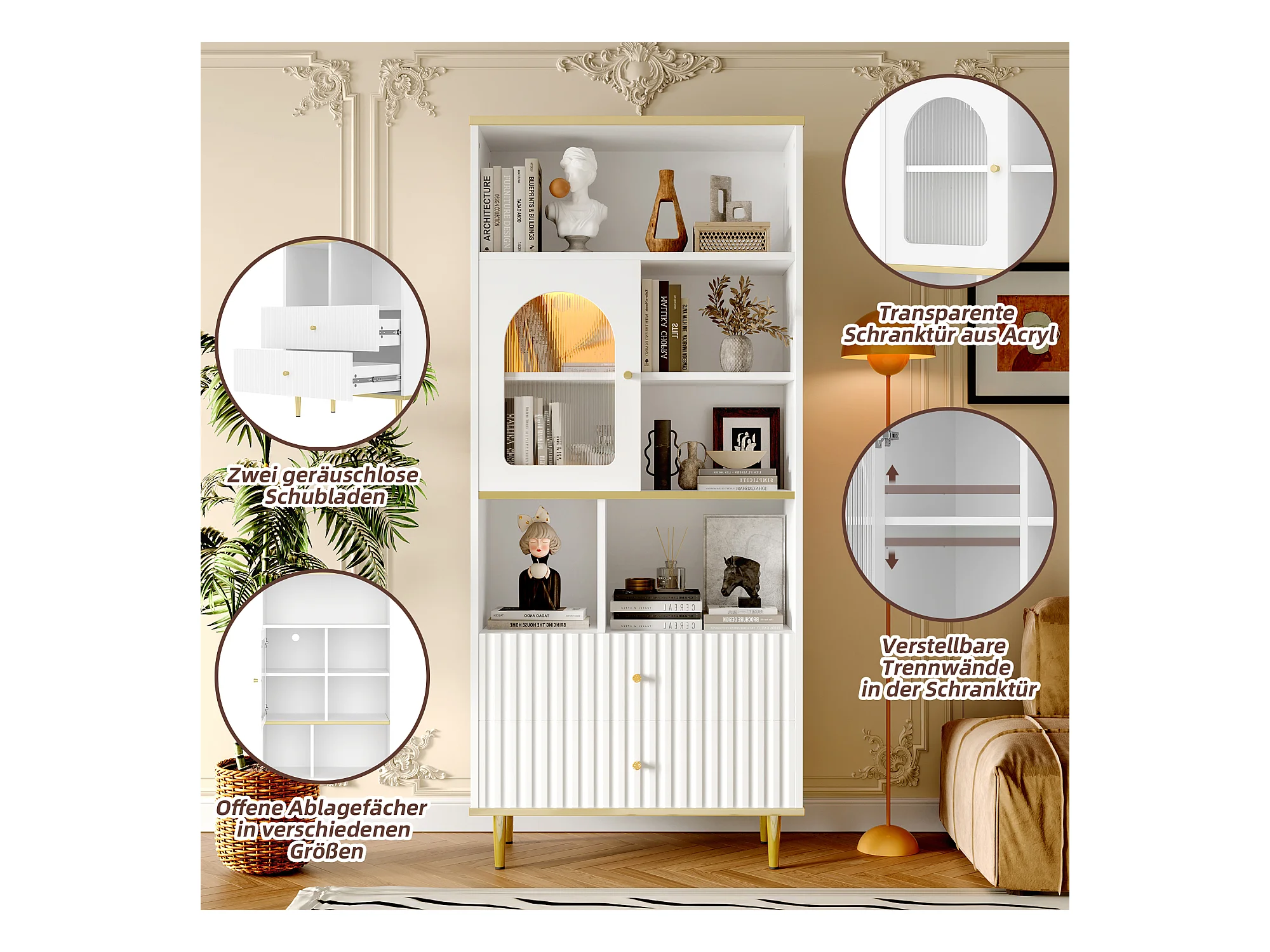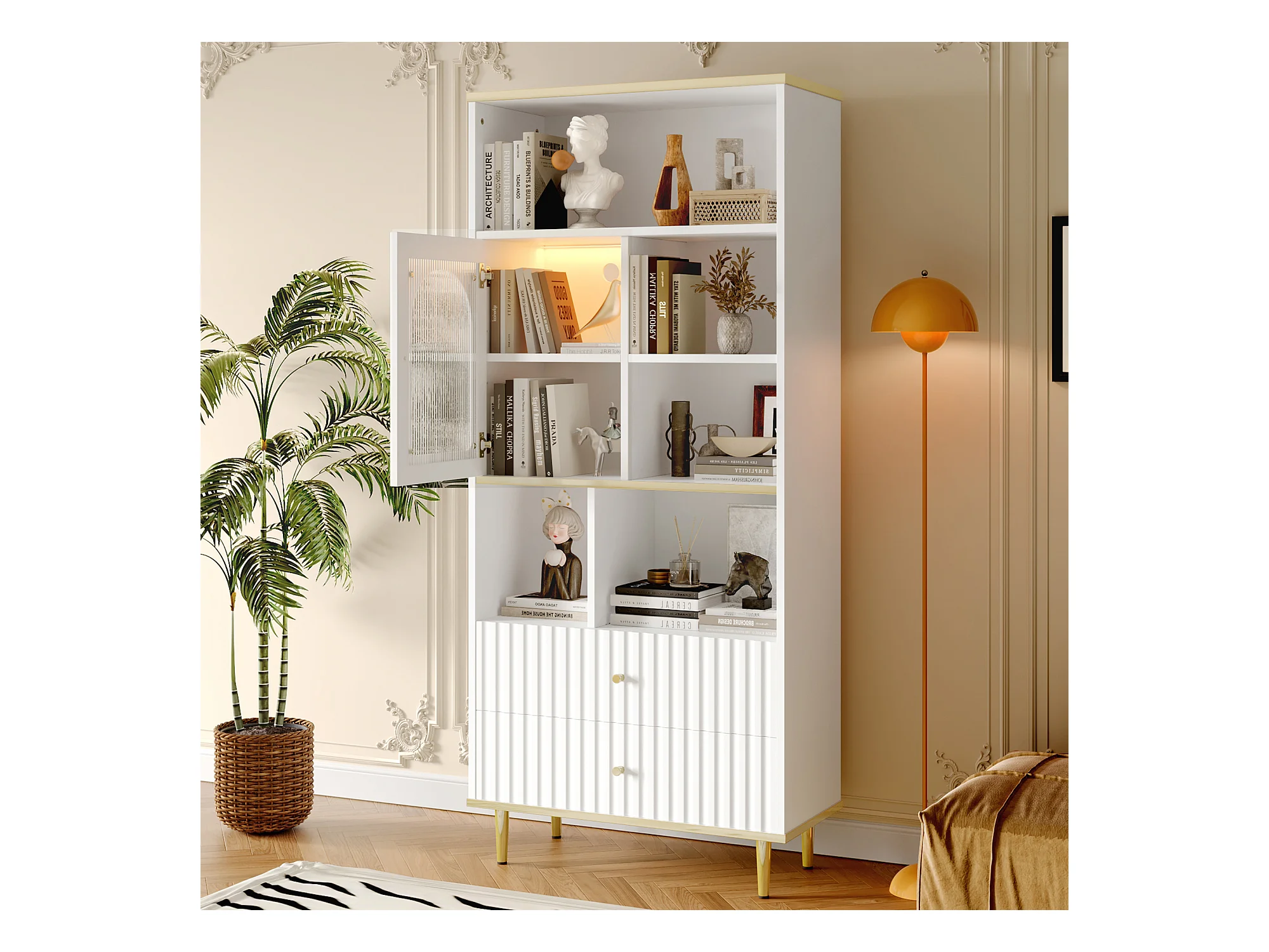 Bibliothèque multifonctionnelle - 78 x 36 x 180 cm - avec 1 porte transparente + 2 tiroirs + Leds - MDF + Métal - blanc