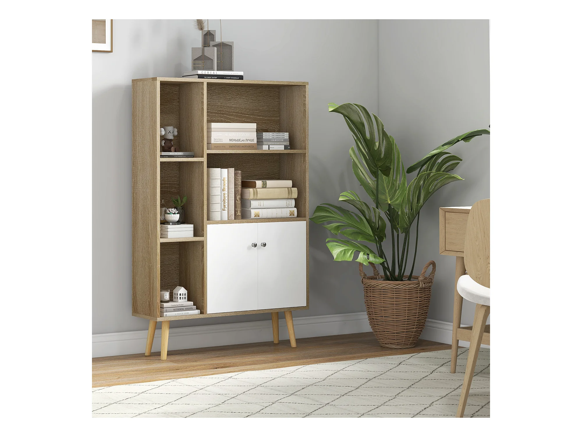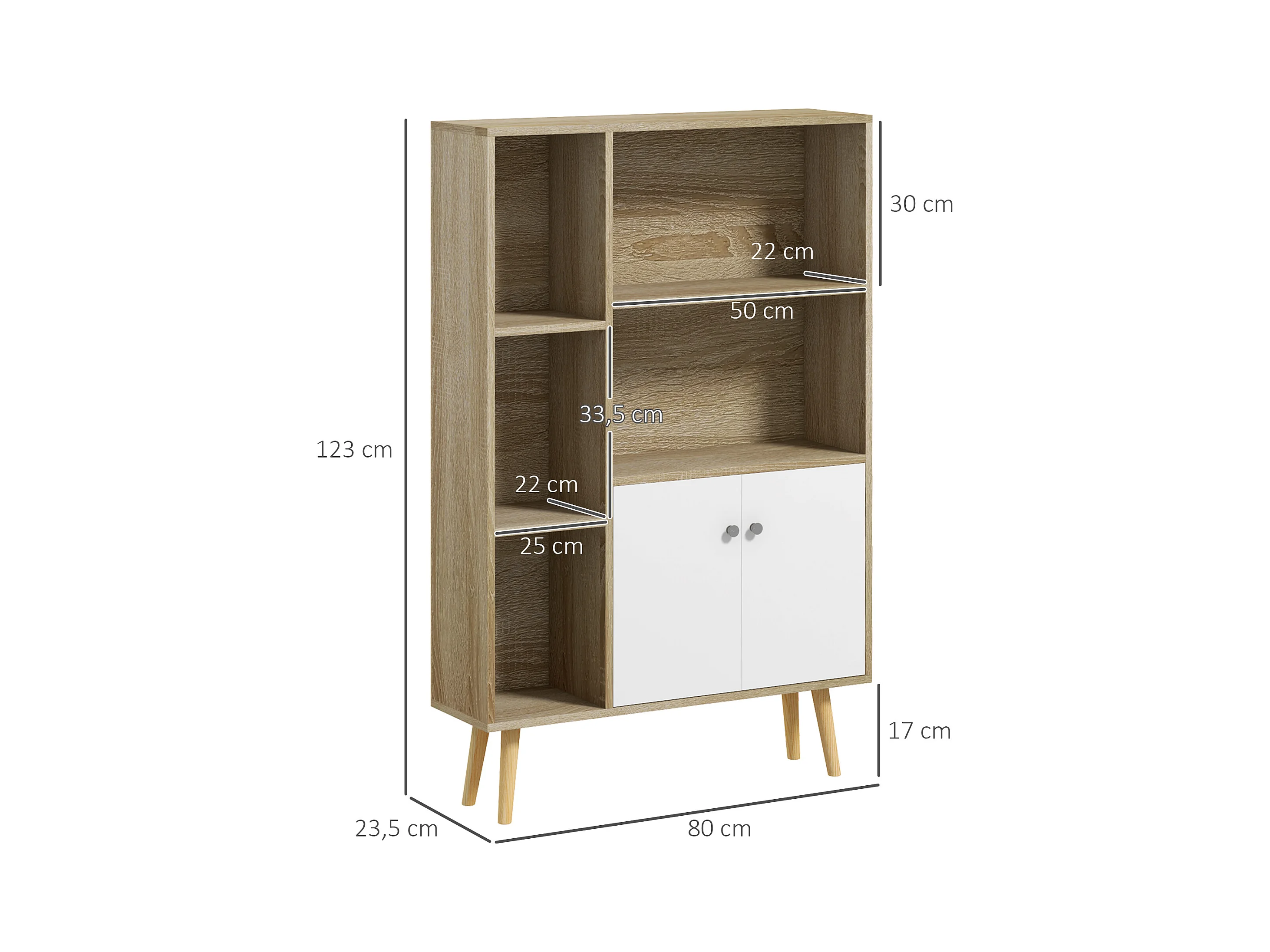 Bibliothèque scandinave 4 niches + 2 placards avec étagère dim. 80L x 24l x 123H cm pieds effilés inclinés bois massif panneaux particules naturel et blanc