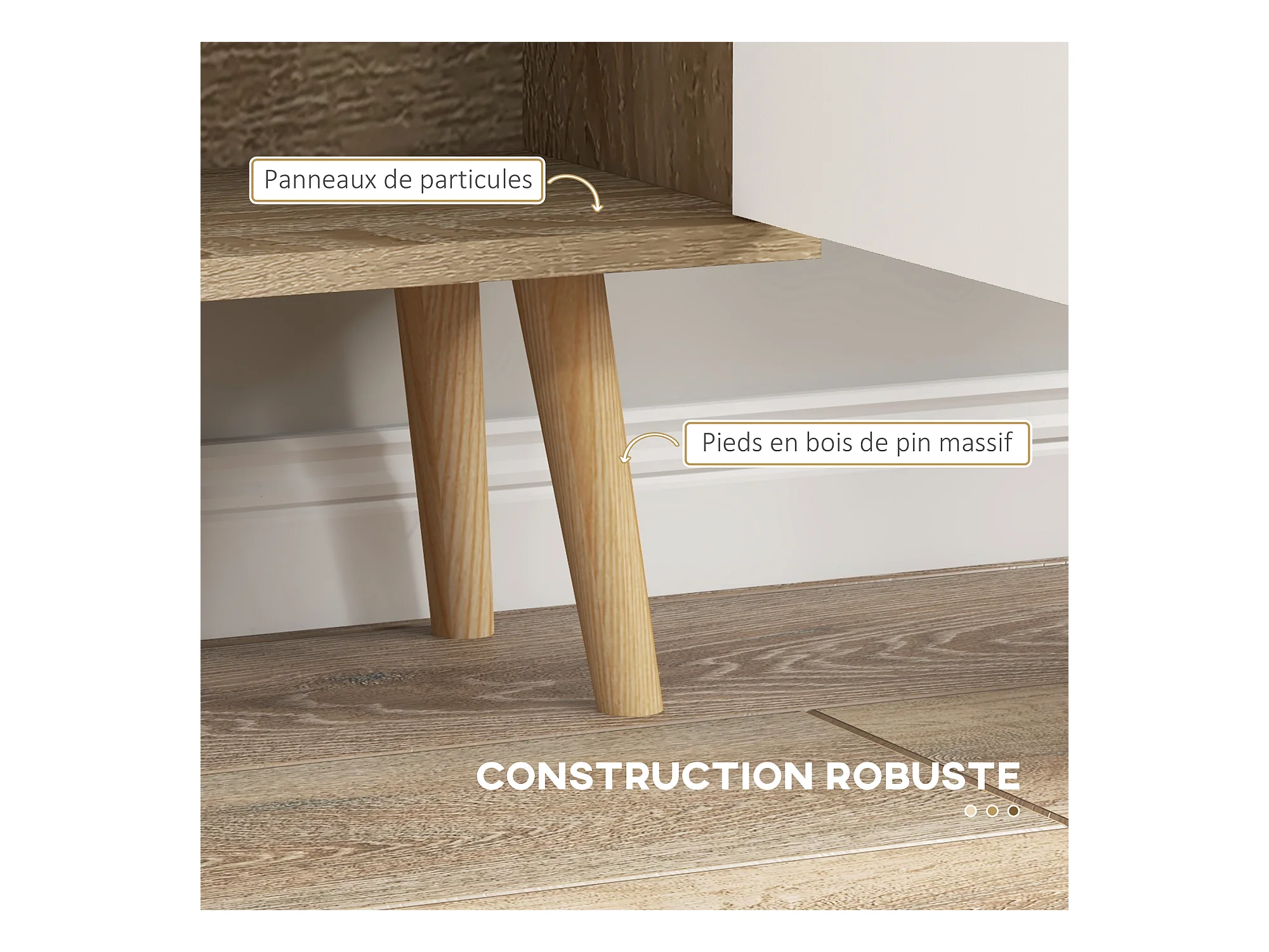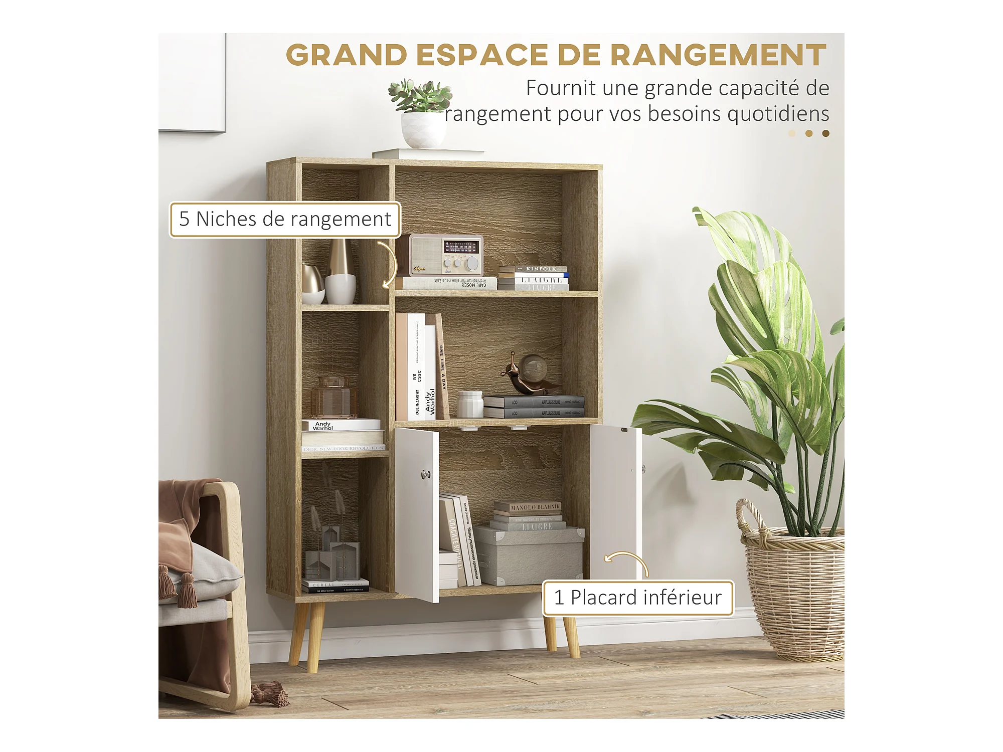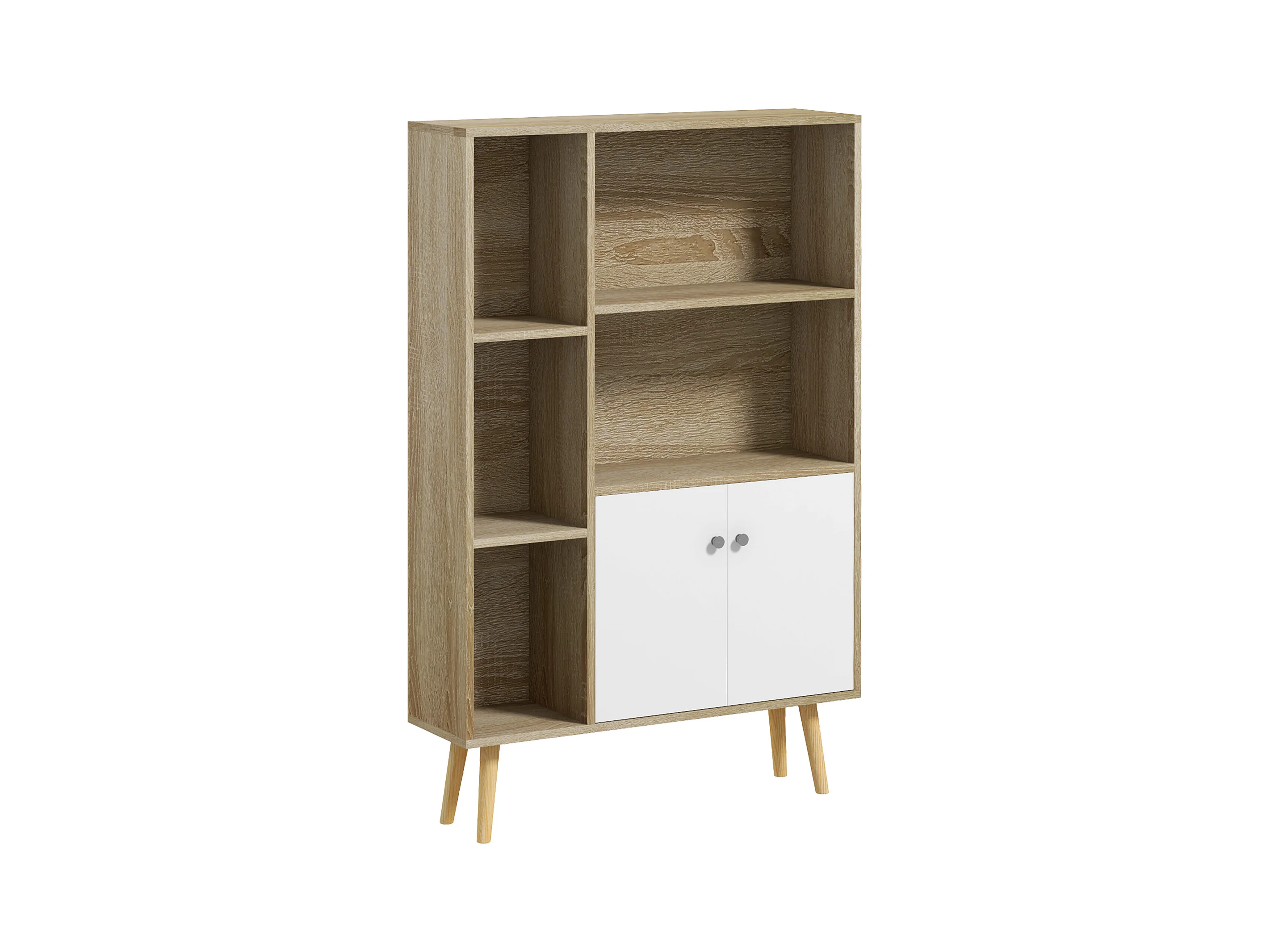 Bibliothèque scandinave dim. 80L x 23,5l x 123H cm 5 niches placard 2 portes pieds effilés inclinés bois massif panneaux particules naturel et blanc